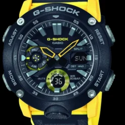 Notable features include a carbon fiber-reinforced case, guardless buttons, front light button, a double case back structure, and in this version a yellow resin band. The Carbon Core Guard gives the GA-2000 a very light weight at 64 grams which is lighter than the GA-100. The display has a 3D index with high-contrast analog hands, LCD subdisplays, and a menu subdial.