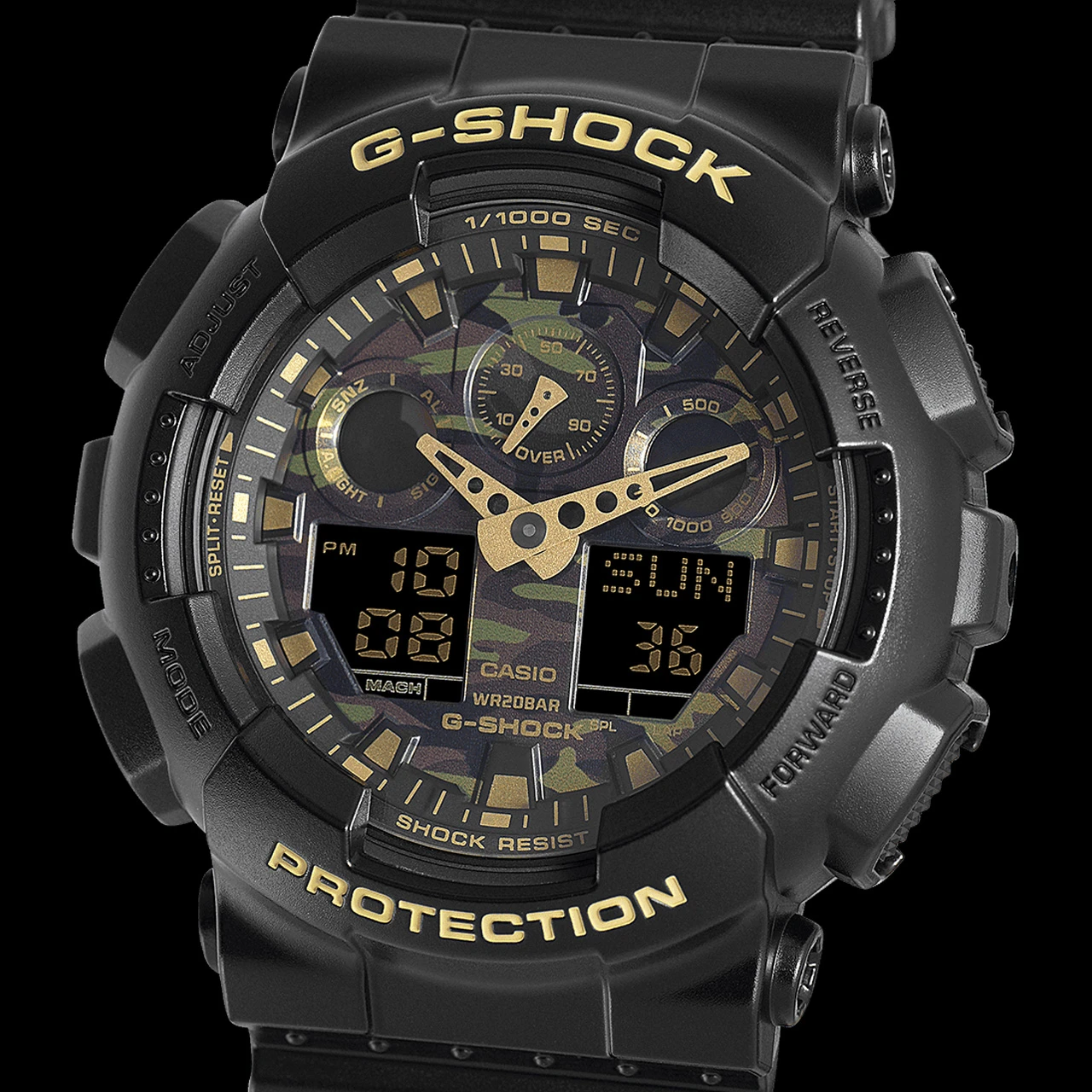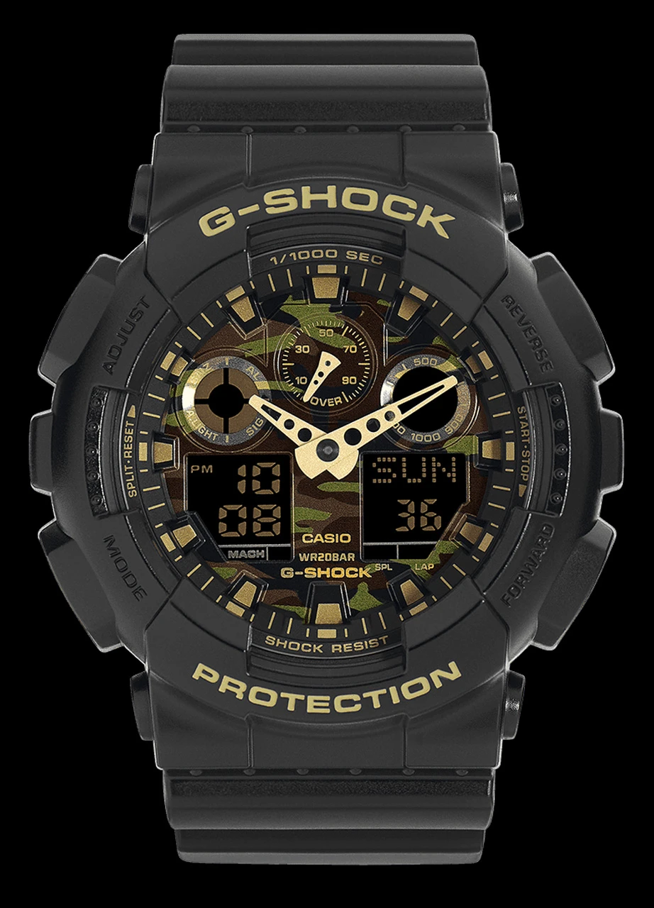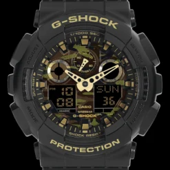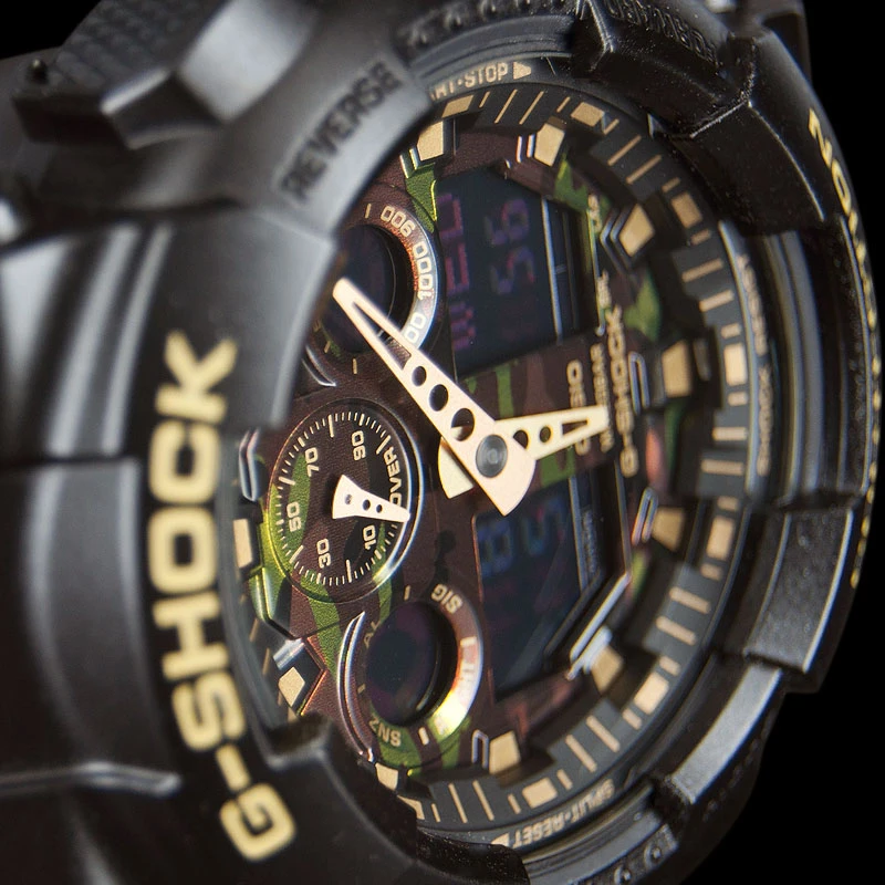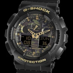 These watches are designed and engineered to deliver outstanding shock resistance, are 200m water resistant, and anti-magnetic. The GA-100CF-1A9ER is beautifully finished in black with a khaki design on the face, reverse LCD display, gold coloured accents, and a black strap for a distinctive look.