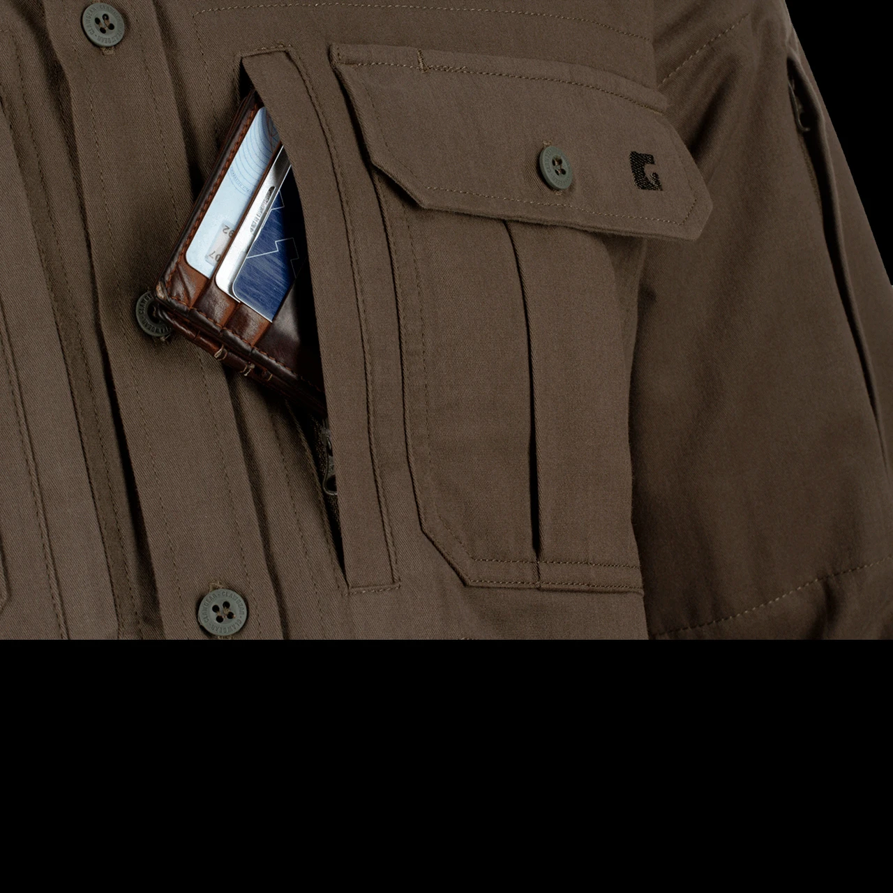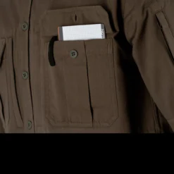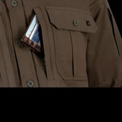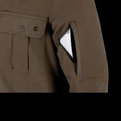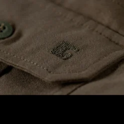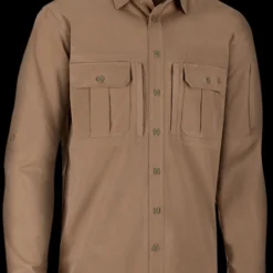 It is a cotton polyester mix and has a pleasant “moleskin” feel. This is the long sleeved version and benefits from four breast pockets; two with buttons and two with zips for small, valuable items such as a fire striker and tinder. It also features one zippered pocket on the left arm again for vital items you need to keep close.Â
