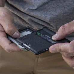 The A10 wallet chassis is made of machined 6061 aerospace grade aluminium and anodized to perfection. The A10 is equipped with Dango’s popular and unique patent pending quick release rail mechanism on both sides of the wallet that allows easy access to cards while keeping them securely in place. On one side of the chassis is a horizontal cavity holding up to 4 cards that is protected by a removable aluminium RFID plate. On the other side is a single card, vertical oriented cavity meant for displaying identification, badges and any cards that needs scanning; perfect for accessing secured buildings and boarding public transportation.
