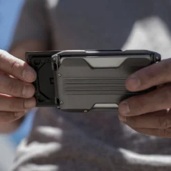 The chassis of the Dango A10 Adapt Single Pocket Wallet is made of machined 6061 aerospace grade aluminium and anodized to perfection. The A10 is equipped with Dango’s popular and unique patent pending quick release rail mechanism on both sides of the wallet that allows easy access to cards while keeping them securely in place. On one side of the chassis is a horizontal cavity holding up to 4 cards that is protected by a removable aluminium RFID plate. On the other side is a single card, vertical oriented cavity meant for displaying identification, badges and any cards that needs scanning; perfect for accessing secured buildings and boarding public transportation.