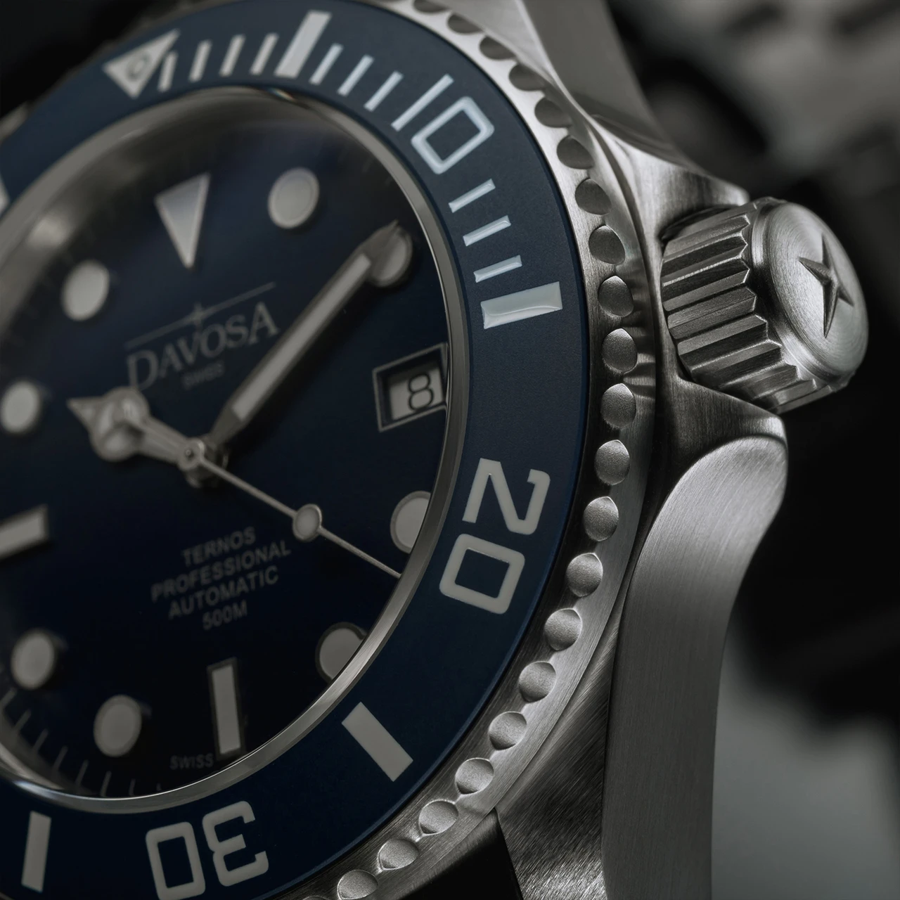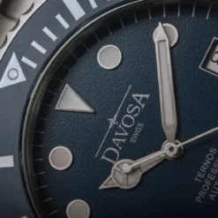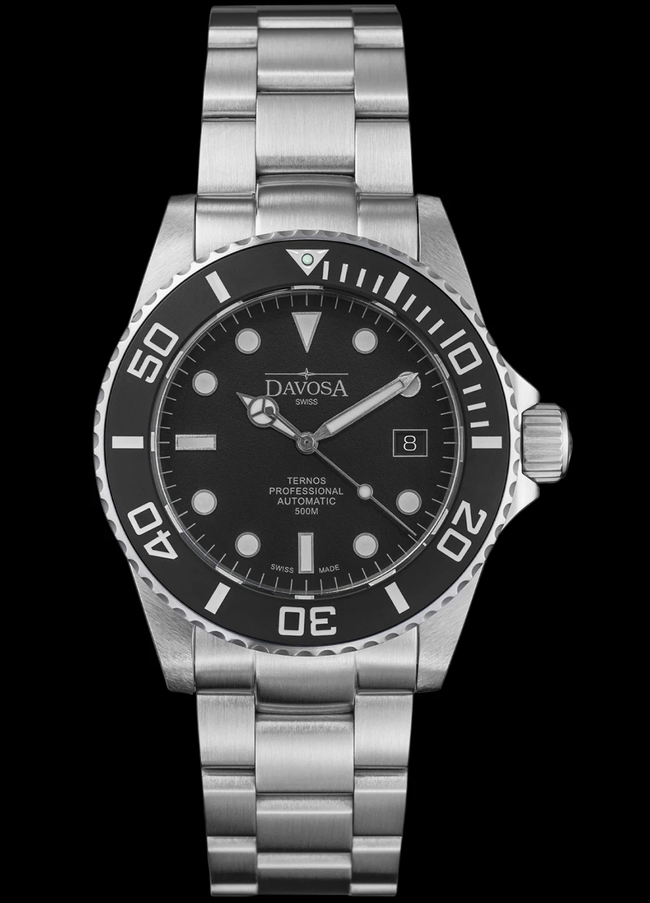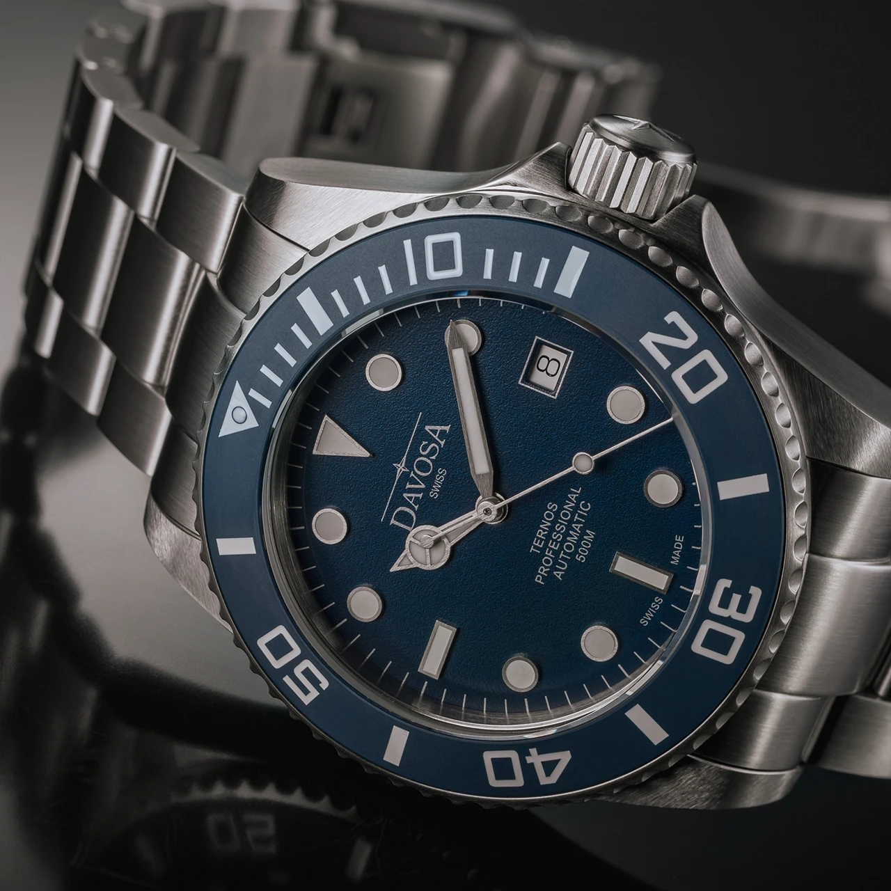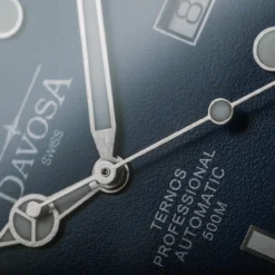 The matt-white marking of the minute scale contrasts with the circular satin bezel insert made of high-tech ceramic and ensures optimum readability. They are optionally available to match the dial in navy blue or deep black. The Davosa Ternos Professional Matt Suit Automatic is completed by a hardy brushed metal strap with screwed links, a safety clasp and a diver’s extension.