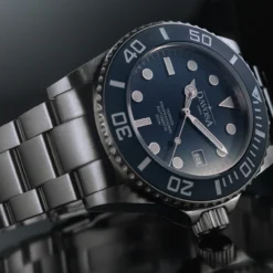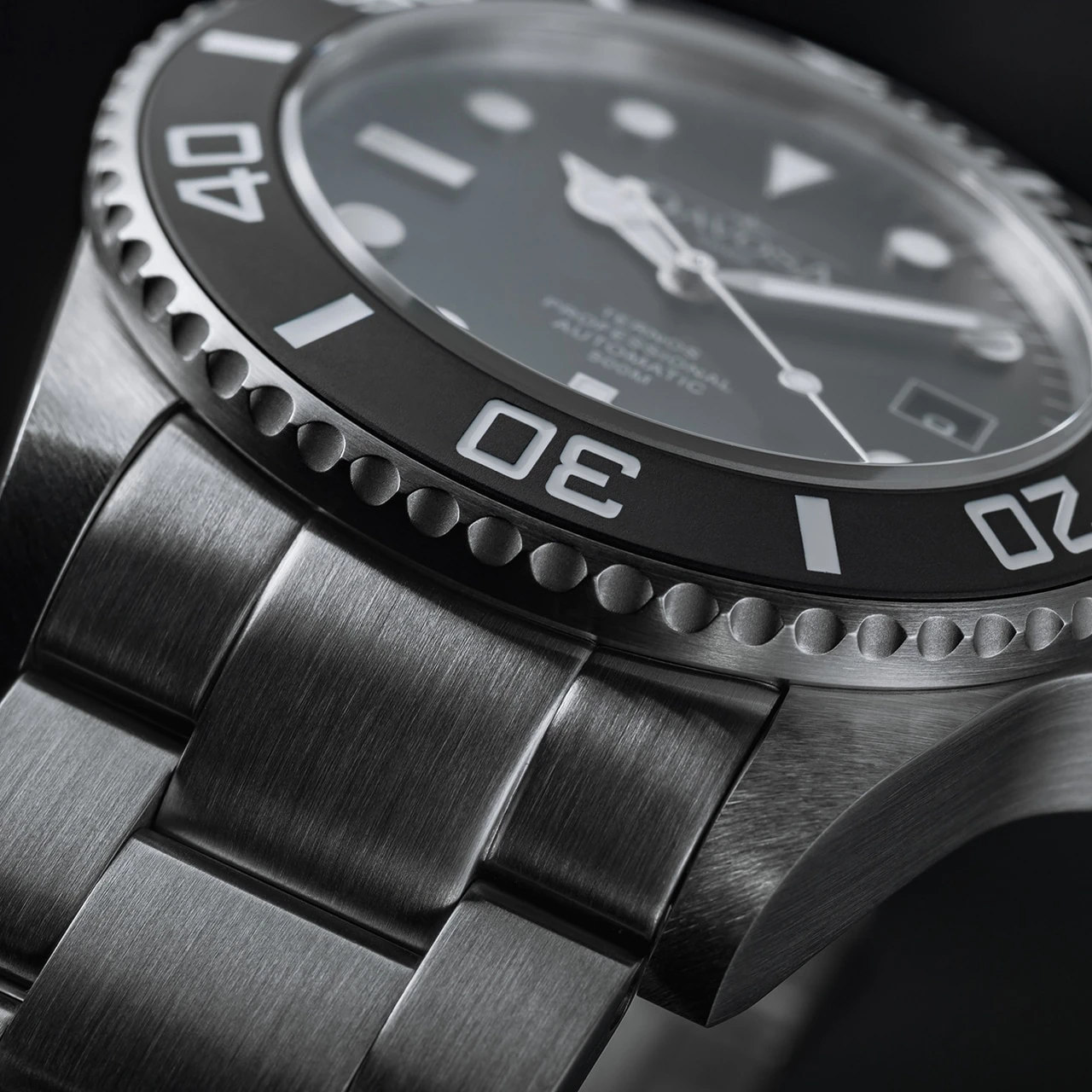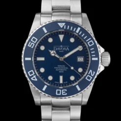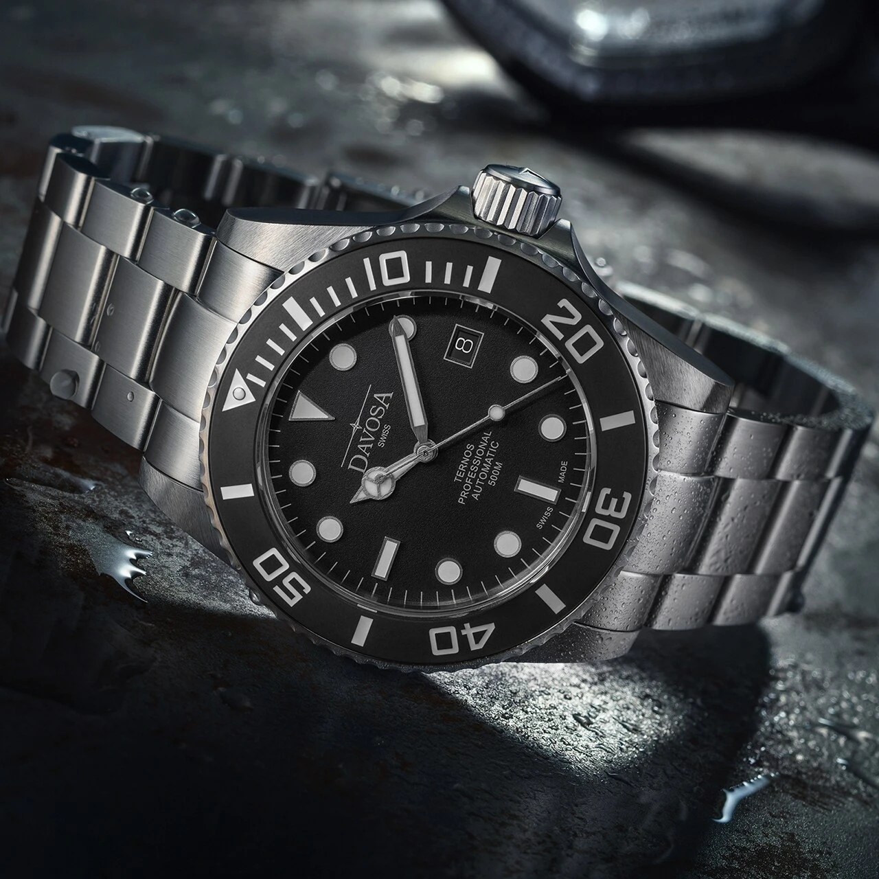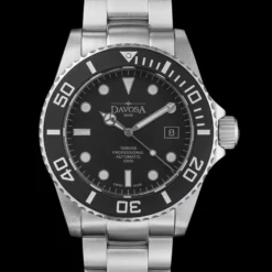 The matt-white marking of the minute scale contrasts with the circular satin bezel insert made of high-tech ceramic and ensures optimum readability. They are optionally available to match the dial in navy blue or deep black. The Davosa Ternos Professional Matt Suit Automatic is completed by a hardy brushed metal strap with screwed links, a safety clasp and a diver’s extension.