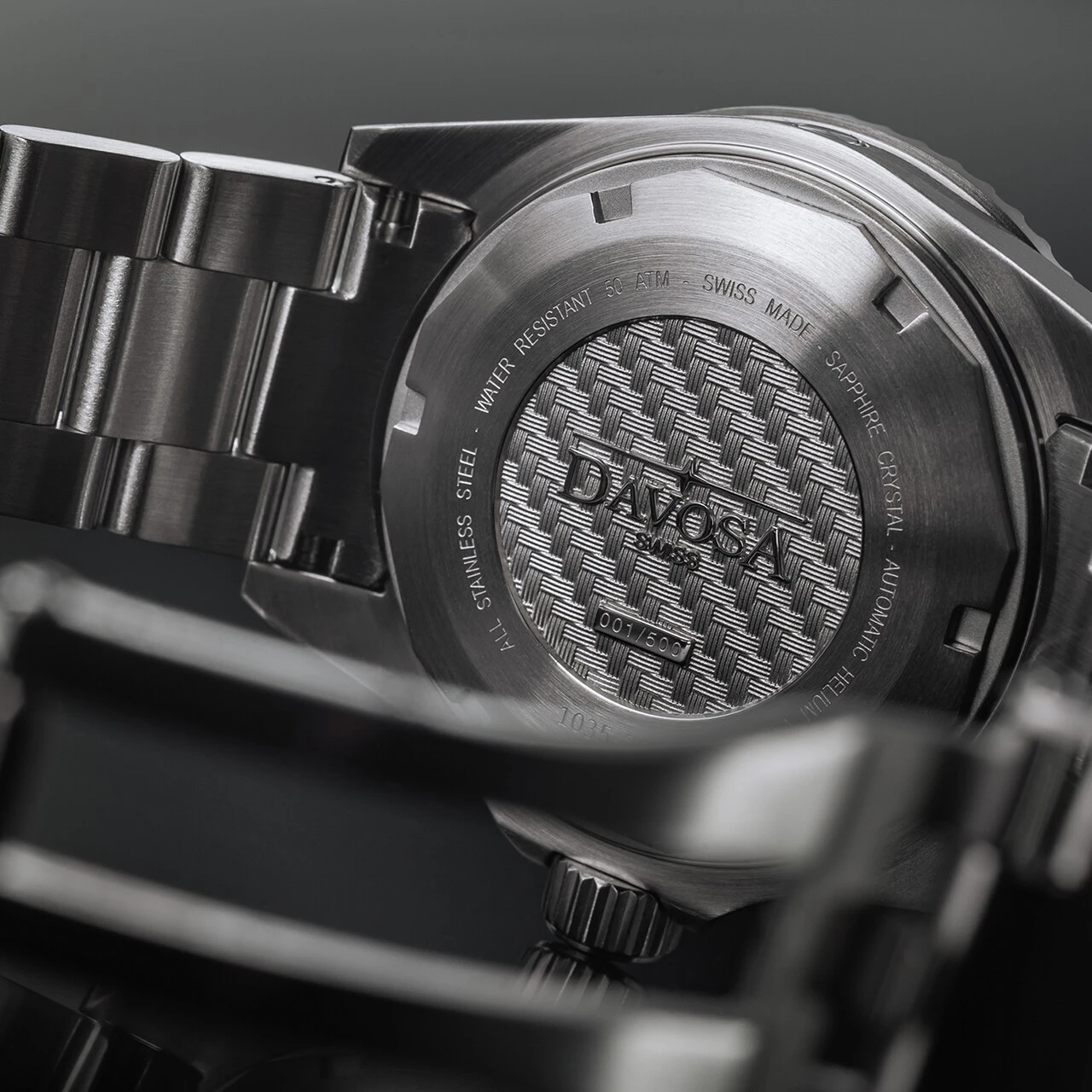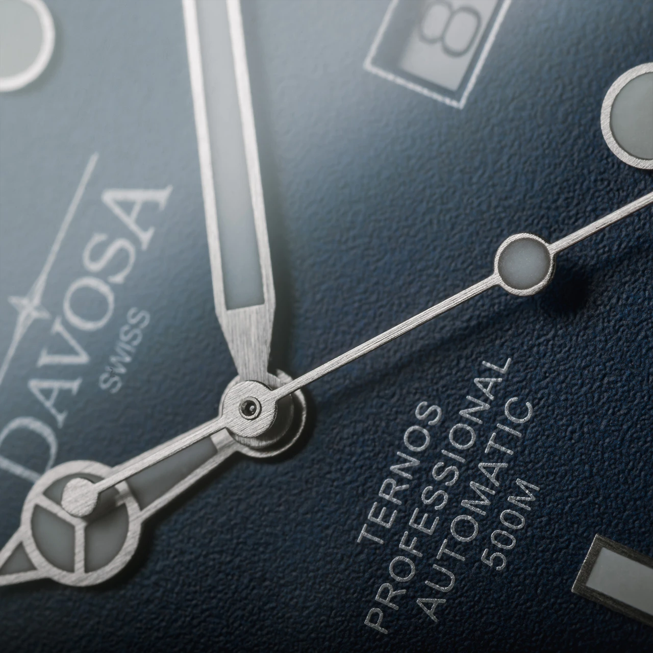 The Davosa Ternos Matt Suit Automatic proves that a matt finish can have many facets: The basis is the matt, structured dial on which the stainless steel indexes and hands with satin surfaces and the white filling made of Superluminova BGW09 stand out.Â