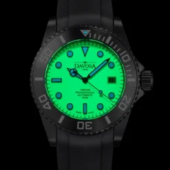 The Davosa Ternos Professional Megalume Automatic is limited to 500 pieces worldwide. At night, the sandy beige dial of the timepiece, illuminates in radiant green. Indexes and hands light up in bright blue. An innovative composition of luminous pigments guarantees the perfect night readability that is so essential for a professional diver’s watch.