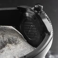 The 50ATM water-resistant case with an automatic helium valve and anti-reflective, scratch-resistant sapphire crystal, as well as a matt, high-tech ceramic bezel fade visually into the background thanks to a black DLC coating. An integrated rubber strap including diver’s extension underscores the unmistakable tool watch character of the Ternos Professional Megalume.