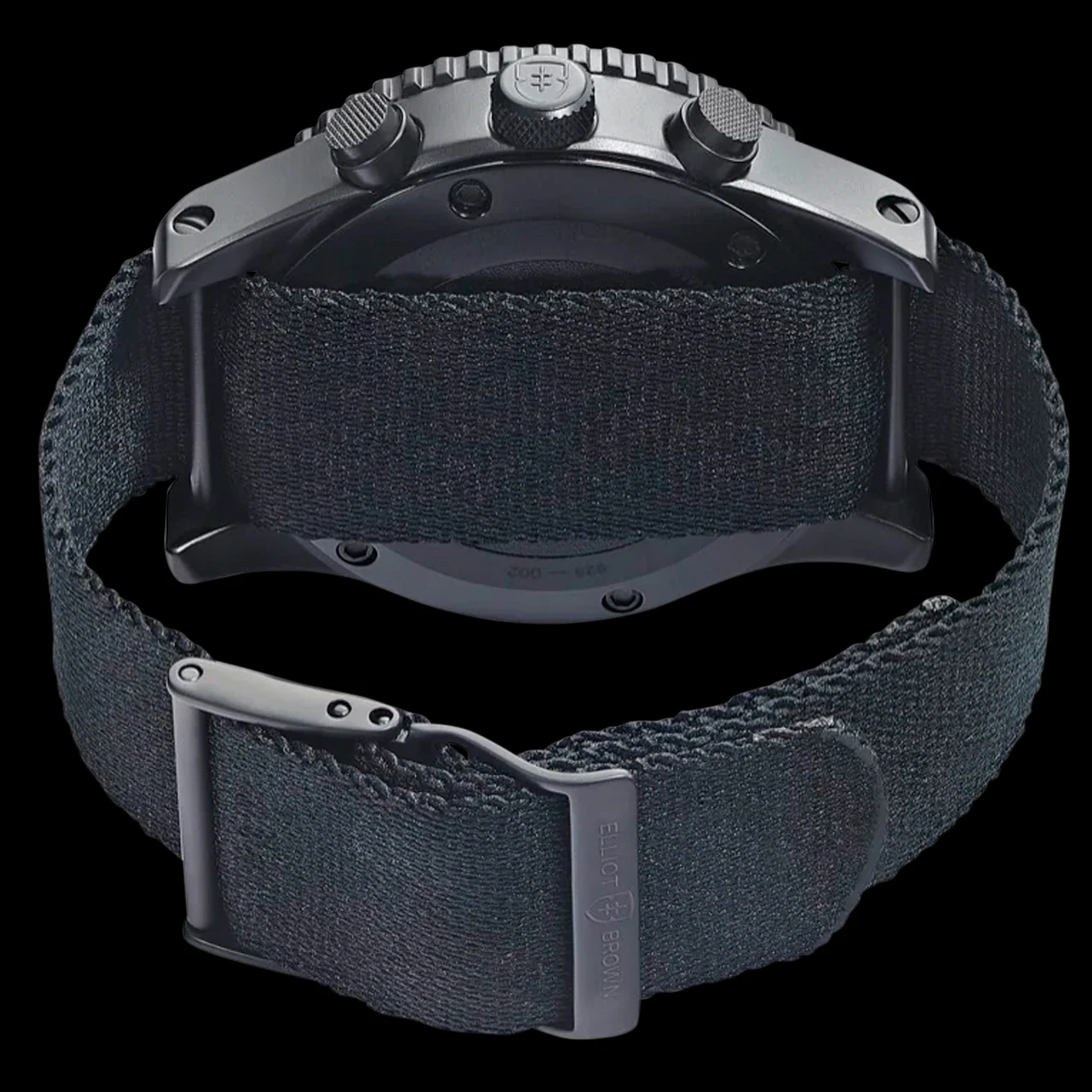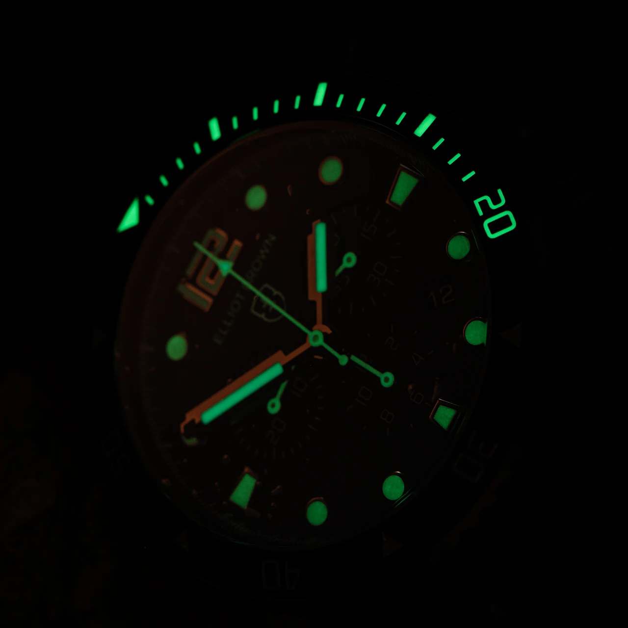 The Elliot Brown Bloxworth Chrono 929-002-N15A is a stealthy watch whose subtle detail grows and grows. X1 C3 SuperLuminova® is a real highlight when the light gets low. One of Elliot Brown’s most indestructible watches.