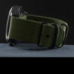 - Custom made olive drab ballistic nylon webbing strap with gunmetal grey hardware