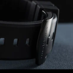 - Black rubber strap with dark gunmetal grey EB tongue buckle