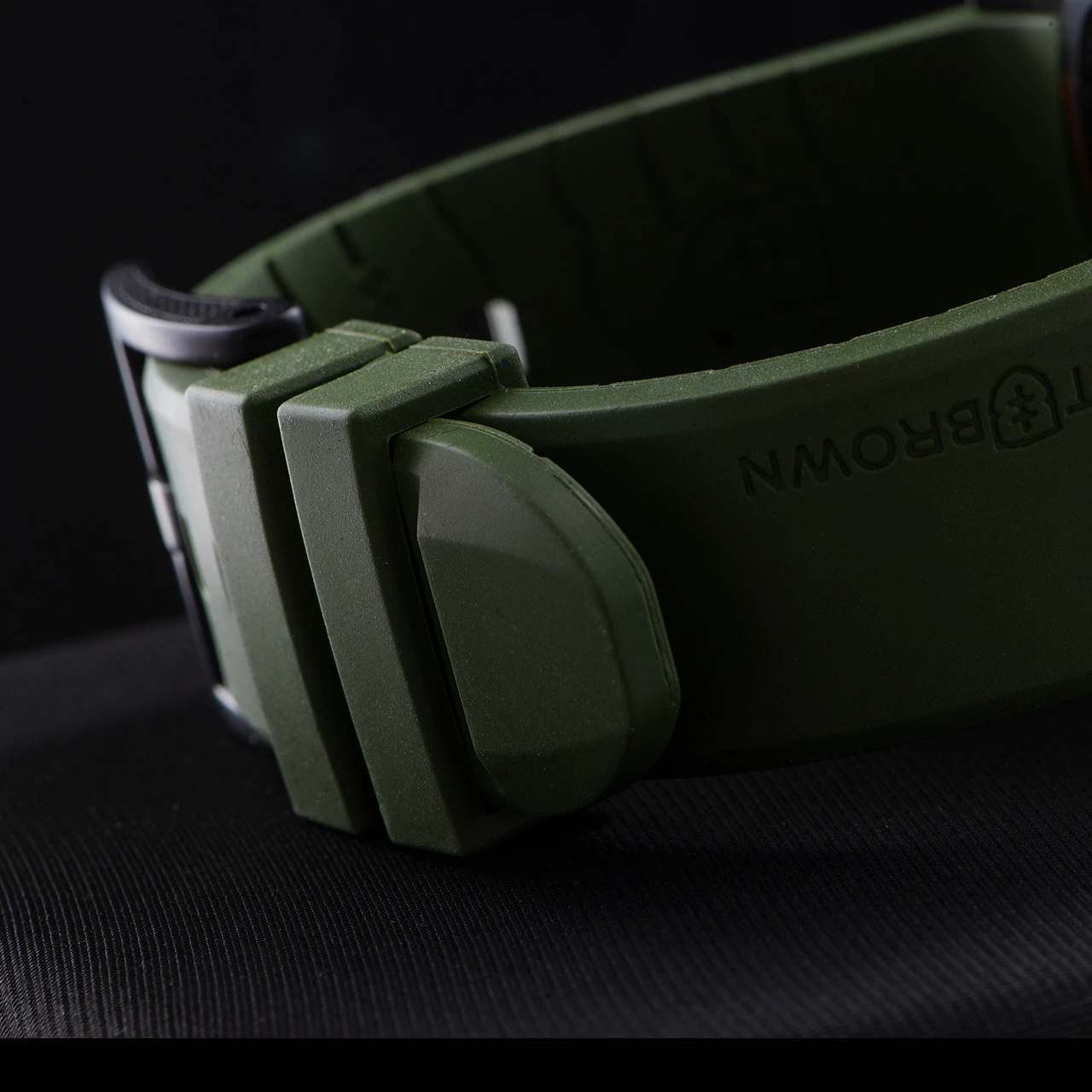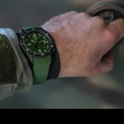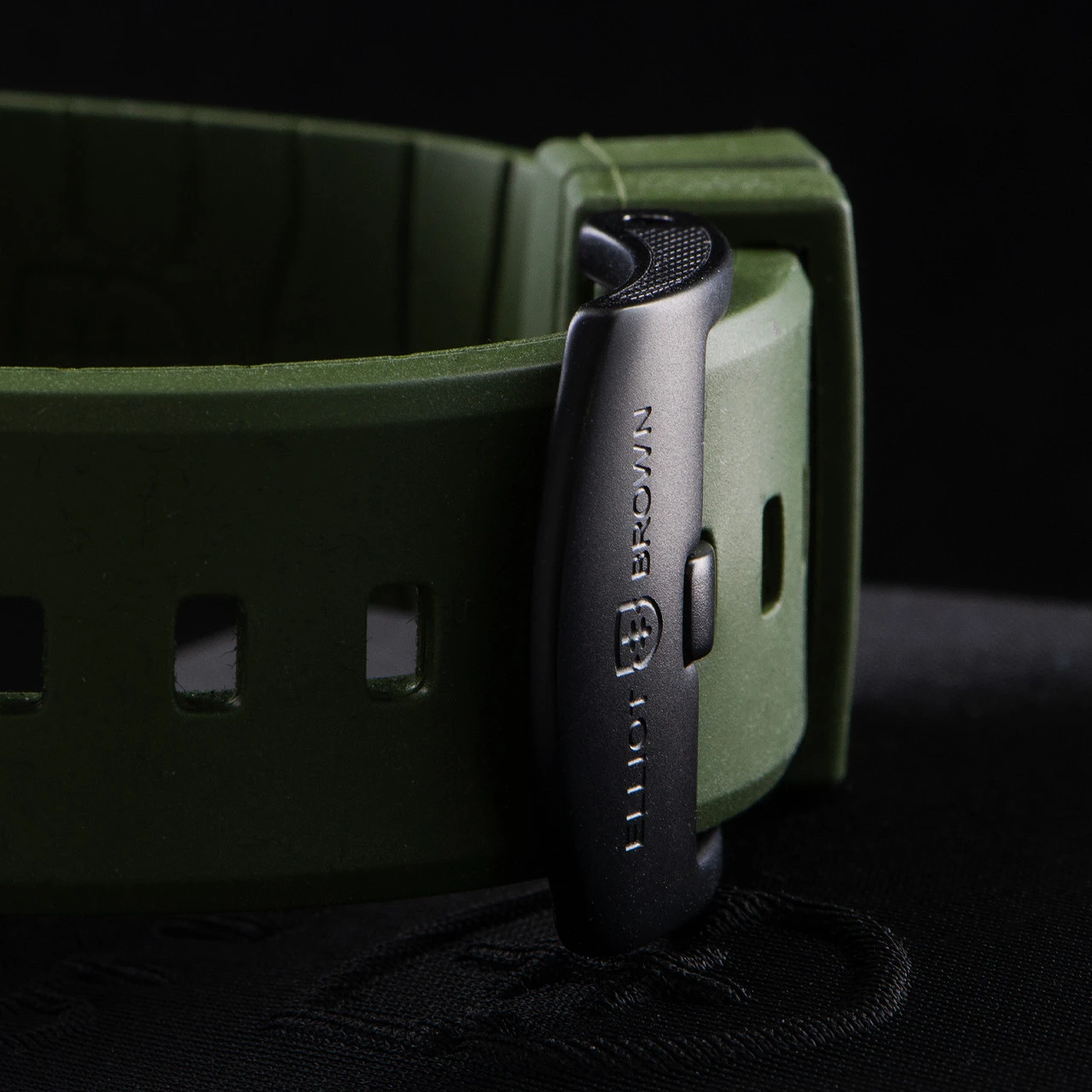 - Strap: Made from premium olive green rubber, this strap was specifically designed for sports, outdoors, and use in and on the water, as it doesn’t absorb water like leather or webbing, and isn’t as heavy as a metal bracelet. All 22mm Elliot Brown straps also fit