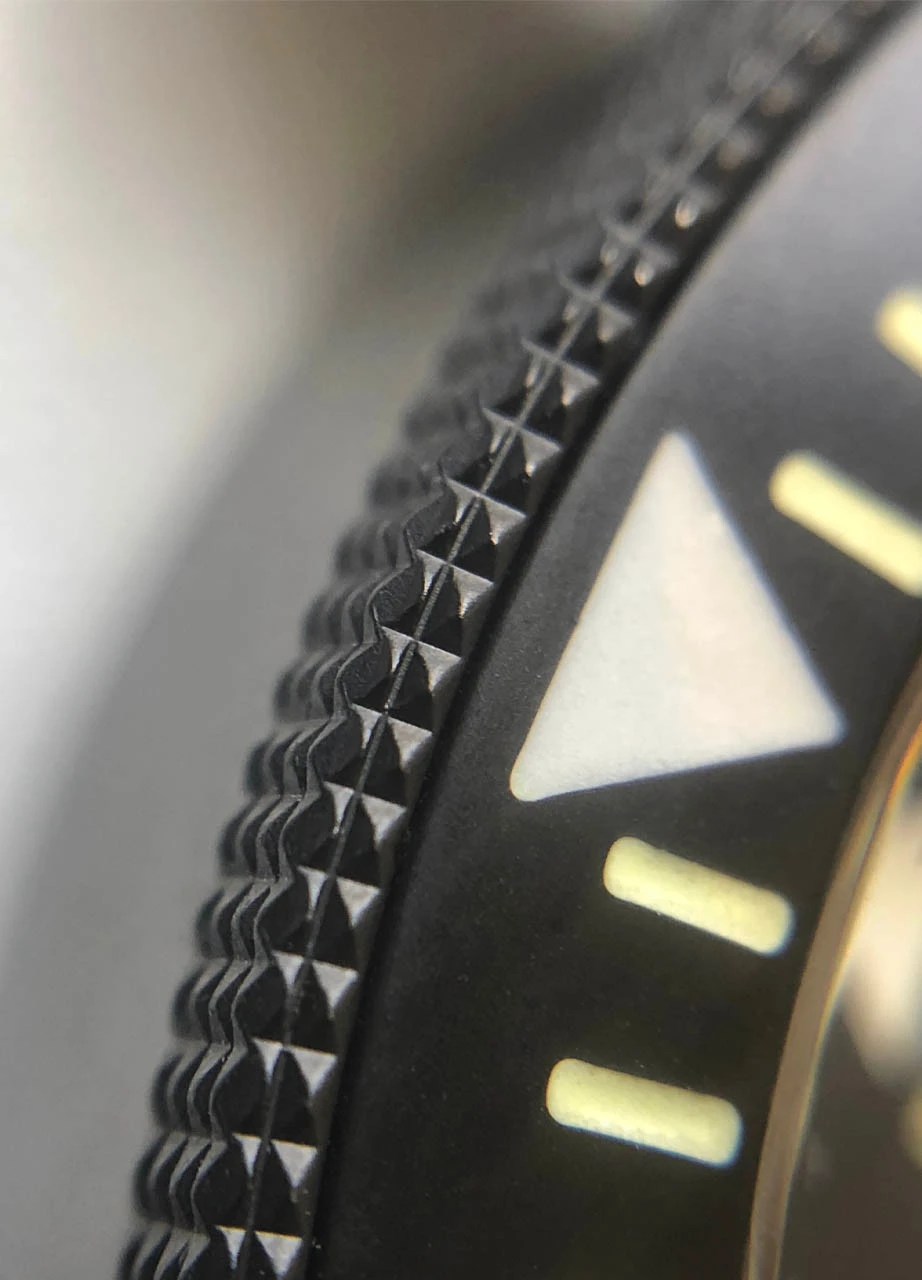 - Bezel: high grip, uni directional divers bezel case hardened to 1200HV Vickers hardness with matt PVD coating whose hardness matches that of the hardened bezel. Highly resistant to marking and provides an outer layer of protection for the watch. The high grip texture enables the bezel to be turned by gripping the sides or pressing downwards and the fine hobnail pattern ensures the bezel can’t be caught on anything, turning it accidentally