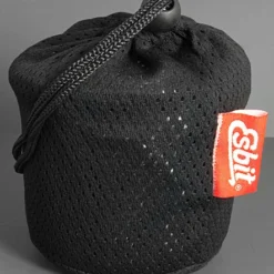 Made of extremely light, hard anodised aluminium. 585 ml pot with lid and wind deflector.Esbit dry fuel (not included). Pot with volume indicator in litres / oz and 2 hinged grips made of stainless steel. Wind deflector can be transported inside pot. Includes mesh carrybag.