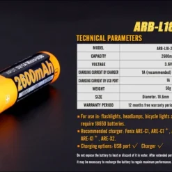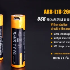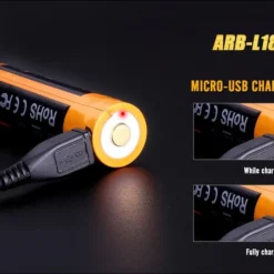 The Fenix ARB-L18-2600U 18650, 2600mAh lithium – ion battery is specifically designed for high intensity led illumination use and is the perfect companion for all current Fenix 18650 powered lights. The 2600U is a highly versatile battery that can be charged in a regular Li-ion charger or, for those customers who already have a charger with Micro USB lead such as a mobile phone charger, the micro USB can be plugged directly into the battery, saving the expense of an additional charger. The Fenix ARB-L18 2600U battery even features its own built-in LED indicators for charging / charged status.