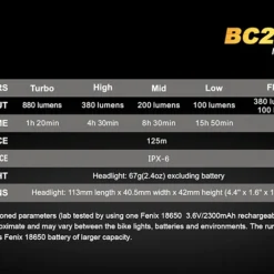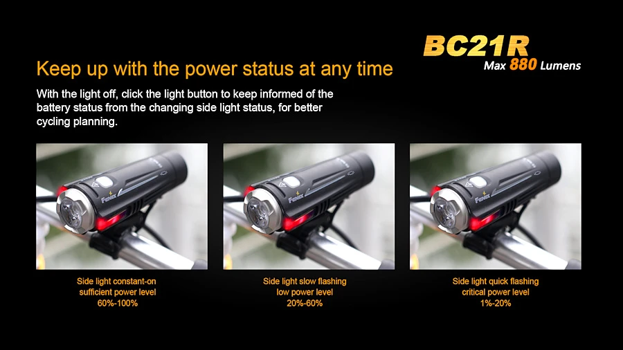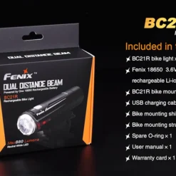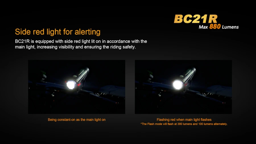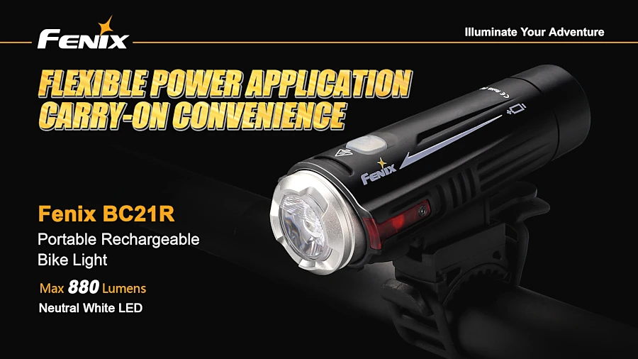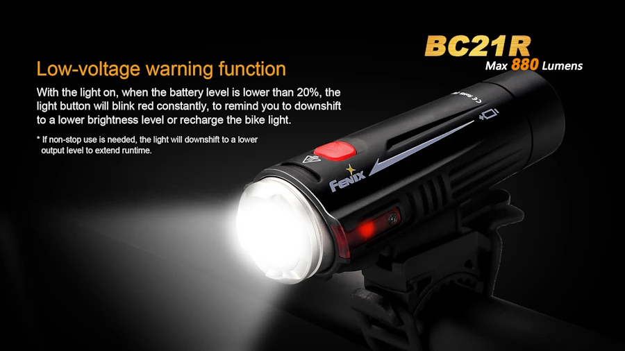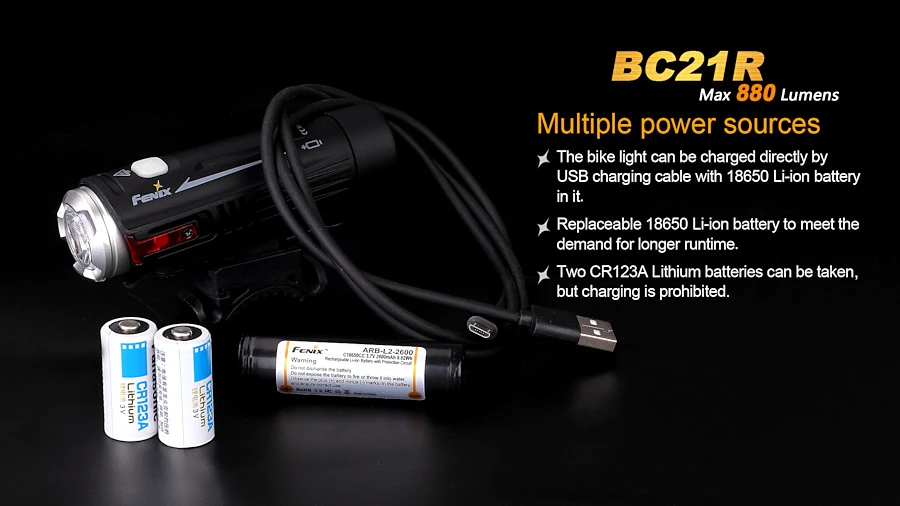 Featuring a quick release mount, removable rechargeable battery (Fenix ARB-L2 2300 mAh 18650 cell) and USB charging lead, the 880 lumen Fenix BC21R bike light offers great performance and versatility in a compact high quality package. The removable battery means that a spare can be carried for longer rides if needed and the cell can be replaced at any time.