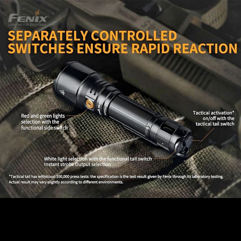 In addition to the white light, the TK26R features a red LED with a maximum output of 150 lumens and a green LED with 200 lumens maximum output. With these three colours available in one compact torch, the Fenix flashlight is ideal for law enforcement applications.