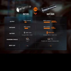 WF26R includes a high capacity Fenix 21700 lithium battery that powers impressive light output and long run times across 4 brightness levels.