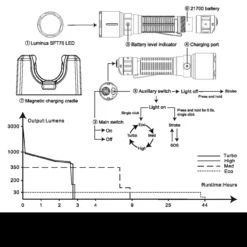 - Turbo: 3000 lumens (2 hours 41 minutes), 450m beam. (Overheat protection steps brightness down gradually to prevent over temperature. Full power can be reset when the torch cools)