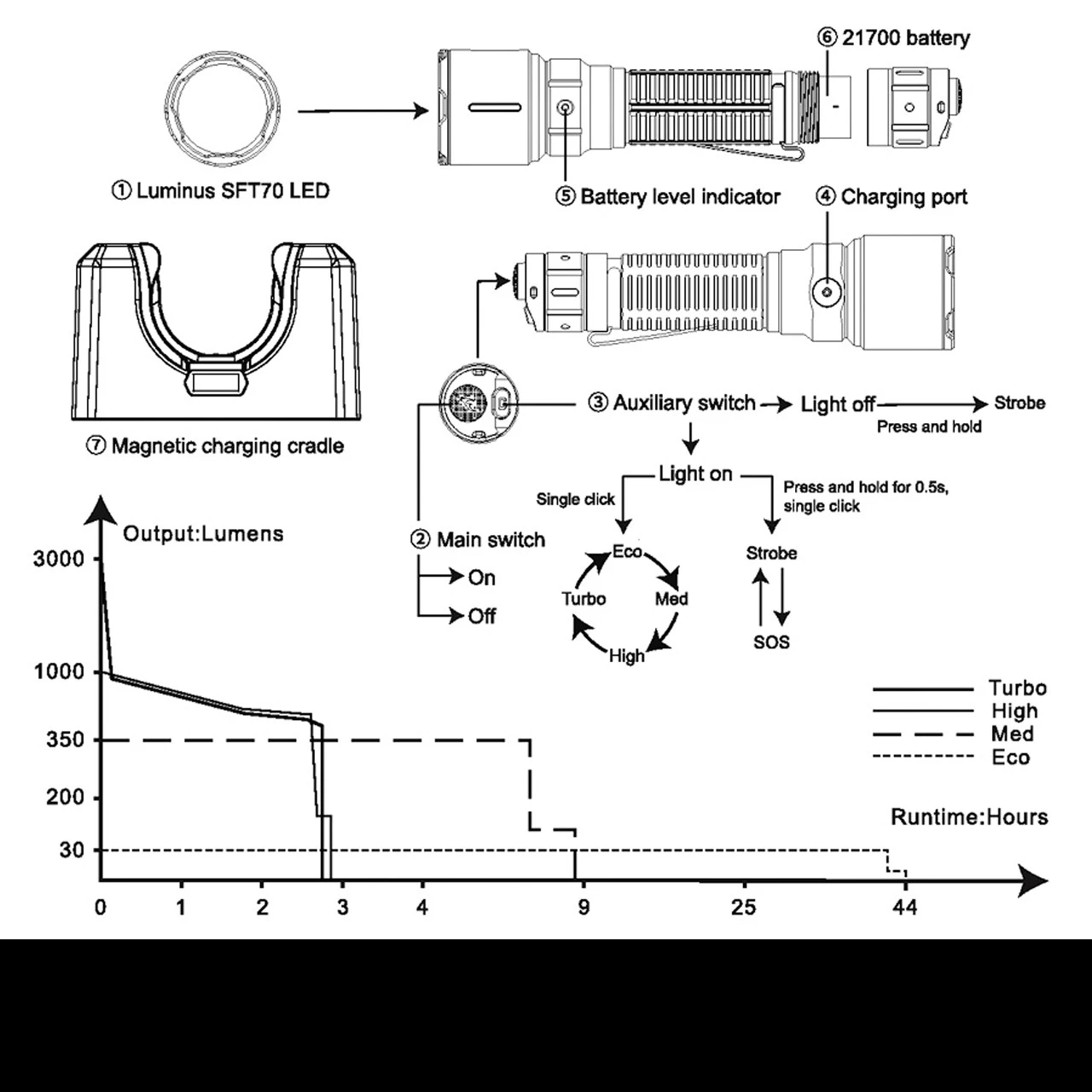 - Eco: 30 lumens (44 hrs 8 min), 47m beam