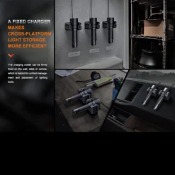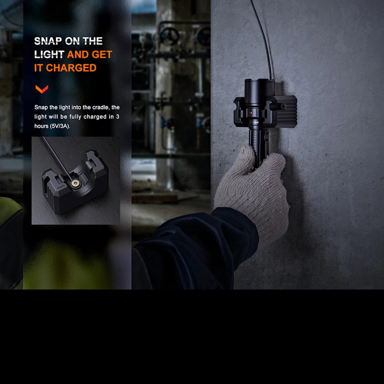 The Fenix WF26R is a powerful 3000 lumen, 450m beam, industrial – work – security – police and rescue LED torch which charges via a compact snap-in charging cradle, suitable for wall, bench and vehicle mounting. The clever charging cable can be removed from the cradle for mobile use and features a magnetic snap-on head for convenient recharging without plugs and sockets.