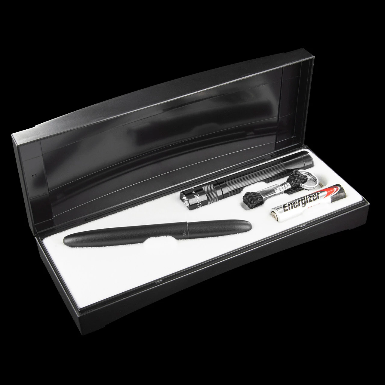 The Fisher Space Pen Bullet and Maglite Solitaire are supplied together in a presentation case. The black Maglite Solitaire incandescent is tiny, around 8cm in length, and weighing in at only 30g with the supplied AAA battery included.
