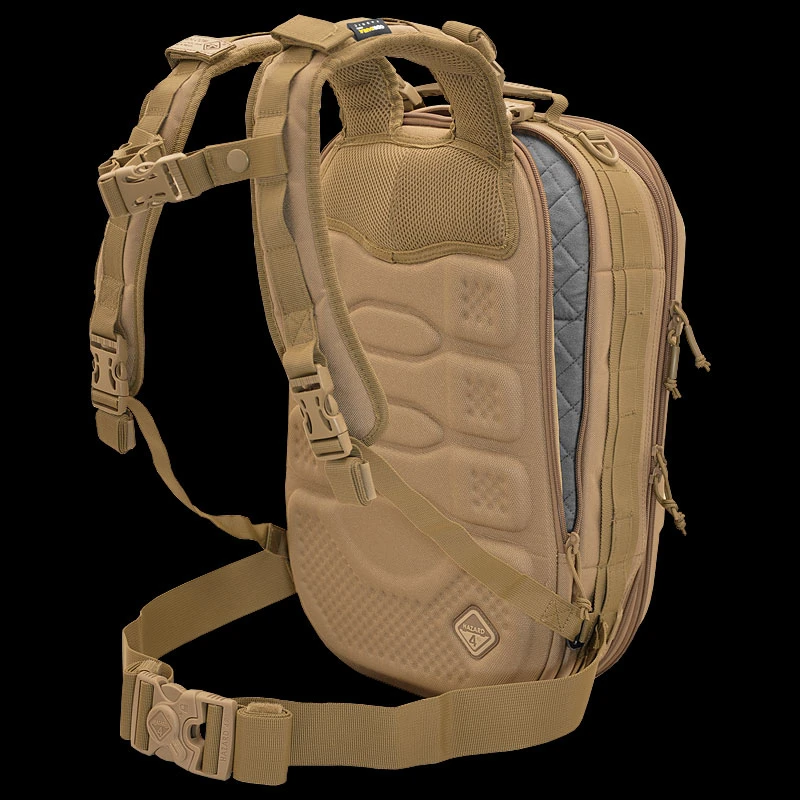 The top shell has 6 spots for the patented Hardpoint® parts allowing optional attachment of loops, lights, bungee systems, molle panels, etc. This pack is also very suitable for motorcycle use as it won’t flap in the wind. Military modular webbing (MOLLE) is provided throughout on the sides, straps, and the interior is lined with velcro panels to allow expansion with pouches, velcro i.d. patches, etc. YKK® Zippers, real Cordura® 1000D nylon, and reinforcing stitch patterns insure lasting quality. Fits up to 16” laptop/tablet/hydration bladder in two padded spaces