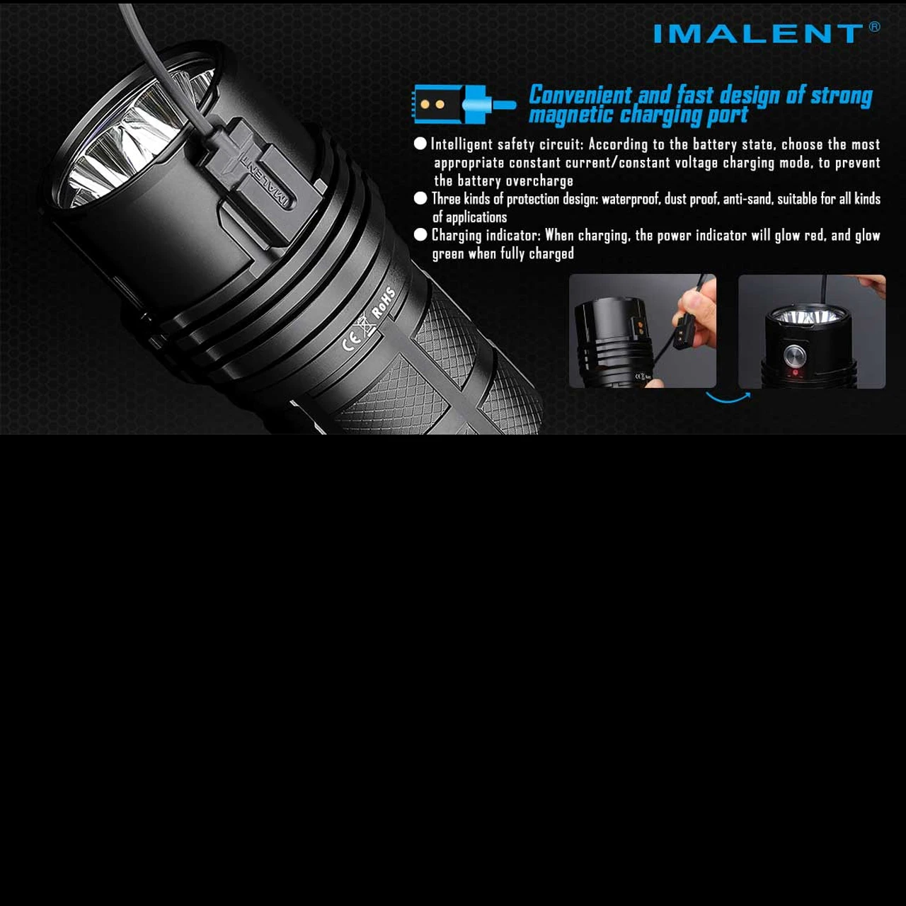 This 25,000 lumen flashlight can be quickly charged with the three included 4000 mAh 21700 Li-ion power batteries via the magnetic USB port. The amount of light that the IMALENT MS06 flashlight emits is truly remarkable. A wide beam angle and strobe function are perfectly suited for search and rescue work.