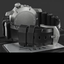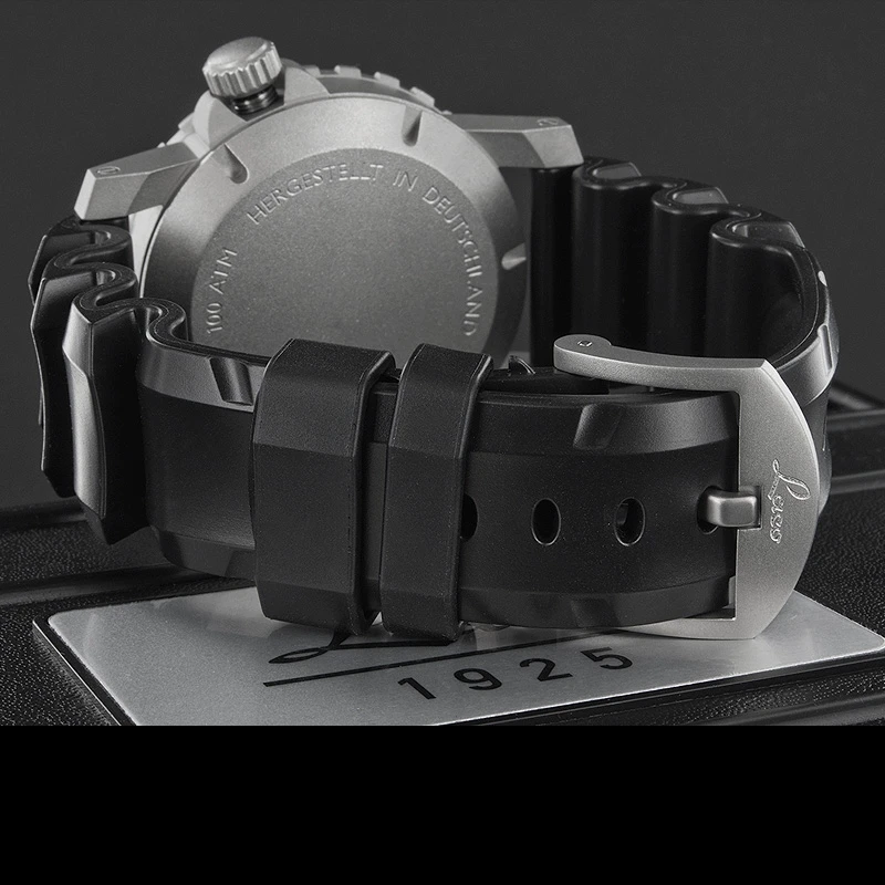 - Strap: Robust rubber band in black with stainless steel buckle, screwed lugs, 24 mm lug width