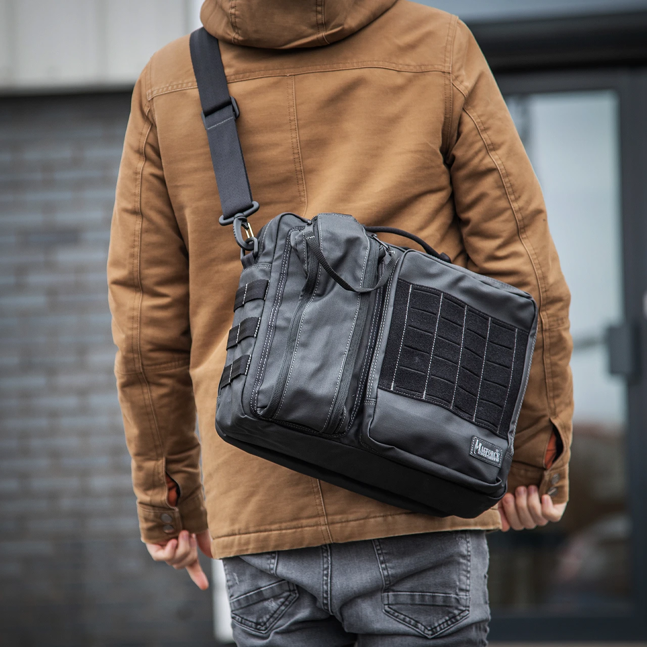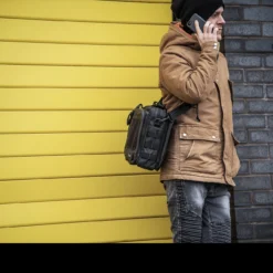 It is supplied with a detachable strap and can be worn on either side of the body and with either side facing outwards. One side features two zippered pockets, a bottle holder compartment with elasticated loops and a wider pocket with MOLLE panel and three internal sleeves. The main compartment has two hook and loop surfaces and a padded laptop sleeve measuring 30 x 26cm. The rear zippered sleeve has a hook and loop surface and two separate sleeves this area is ideal for folders, books etc.