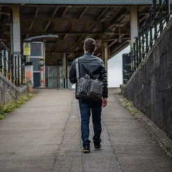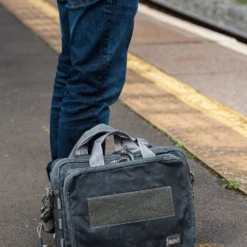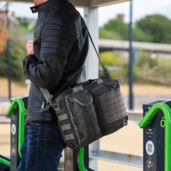 It is supplied with a detachable strap and can be worn on either side of the body and with either side facing outwards. One side features two zippered pockets, a bottle holder compartment with elasticated loops and a wider pocket with MOLLE panel and three internal sleeves. The main compartment has two hook and loop surfaces and a padded laptop sleeve measuring 30 x 26cm. The rear zippered sleeve has a hook and loop surface and two separate sleeves this area is ideal for folders, books etc.