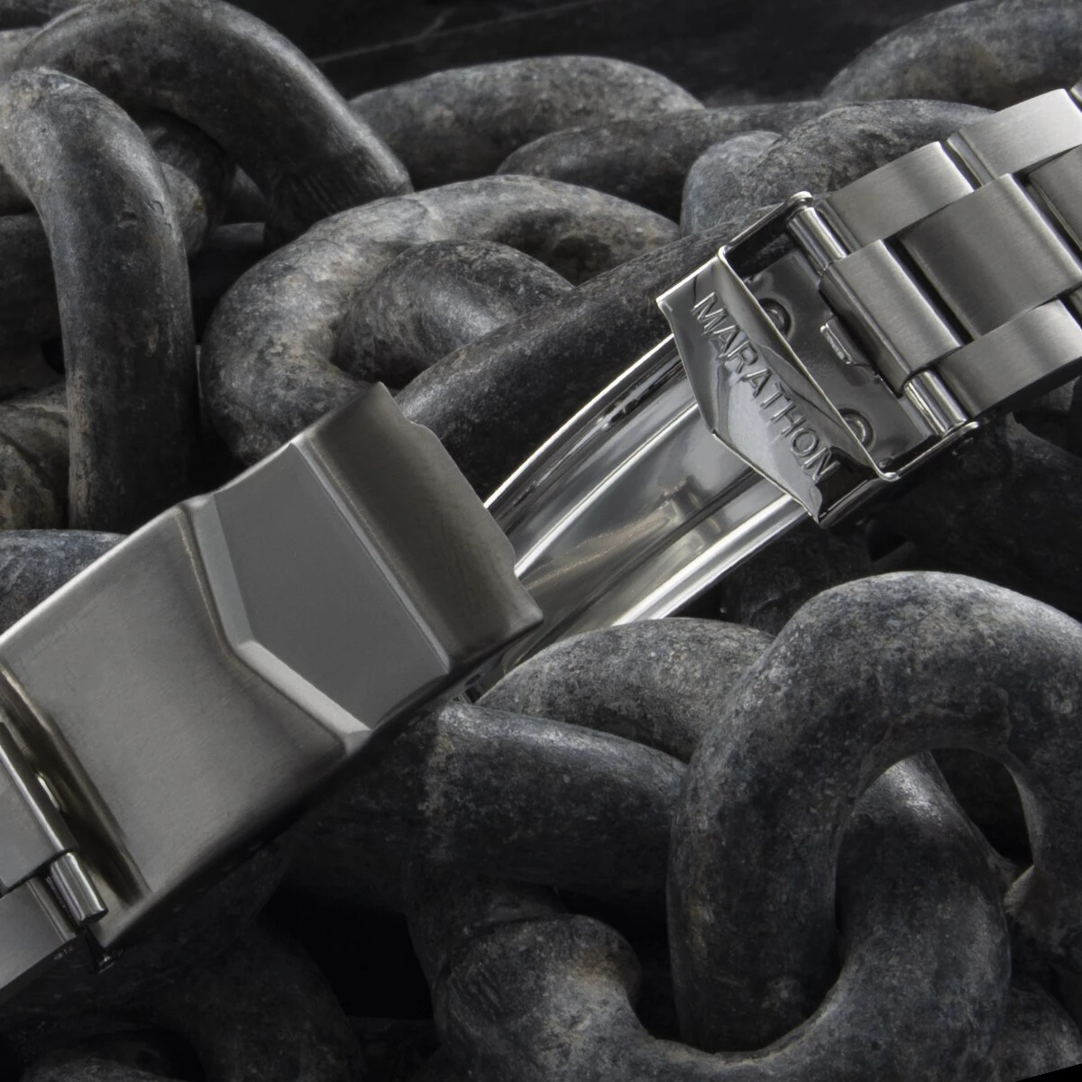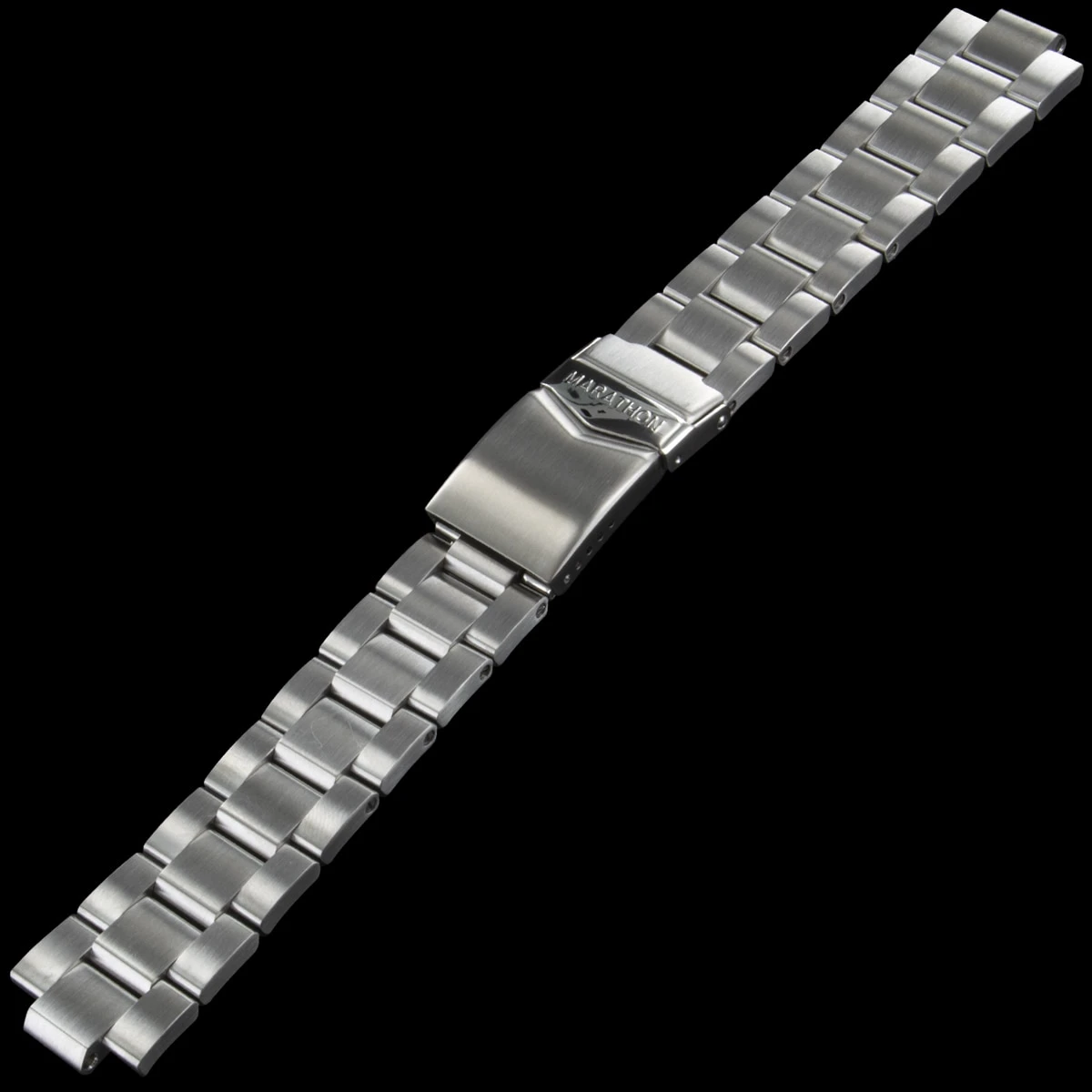 The Marathon Sterile 20mm Stainless Steel Bracelet is made using high quality 316L stainless steel in a fine satin finish and contains a total of 14 solid links. It features a superior floating double screw link system and a locking buckle for extra security. It also has a diver’s extension hidden underneath the clasp.