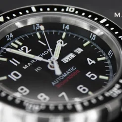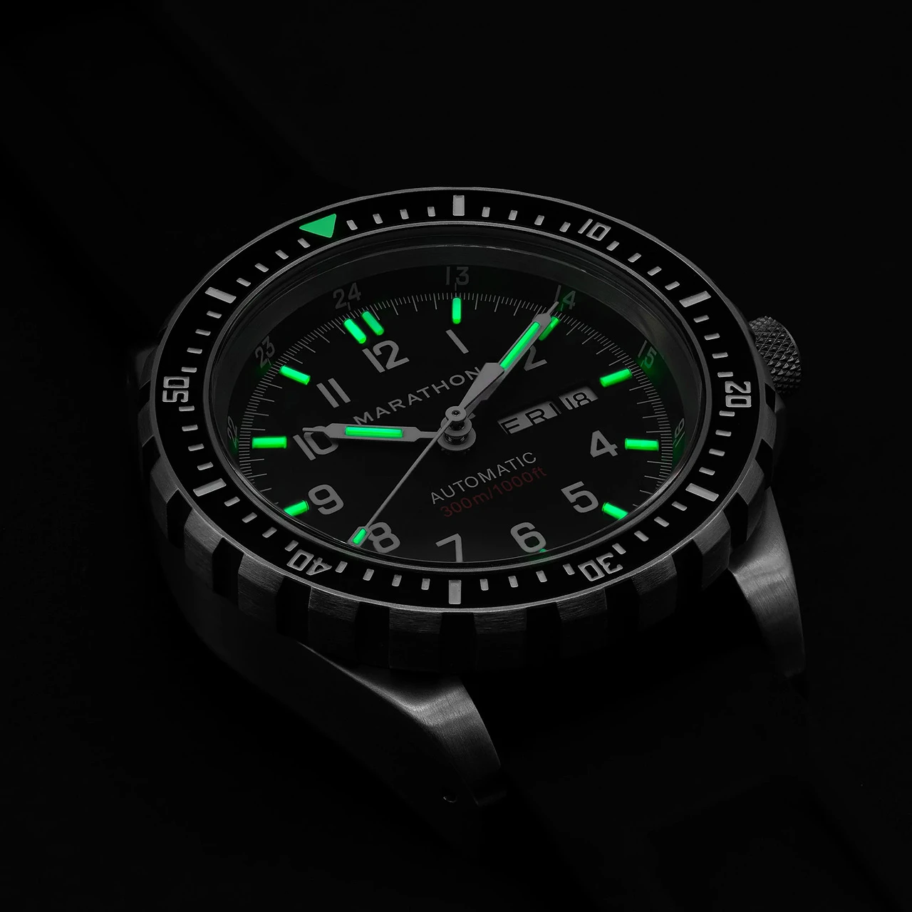 The Marathon Large Bilingual Diver’s Automatic is a large dive watch that displays the date and day of the week in English or French. Designed for use by Search and Rescue (SAR) divers, the Large Bilingual Diver’s Automatic is a watch built to withstand the most extreme of conditions. The watch is also known as the Jumbo Day Date (JDD) and is certified for water resistance to 30 ATM – 300 meters (1000 feet).