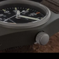 The General Purpose Quartz is made from a highly durable fibershell case that is water resistant to 3 atmospheres (30 meters – 100 feet) and will not yield to the elements. The fibershell case of the General Purpose Quartz also has a passive matte finish. This matte finish aids in protecting infantry positions as this finish does not provide a reflective surface which would occur on a normal metal case. Fibershell is also an extremely lightweight material, an important factor on the battlefield where every ounce counts.
