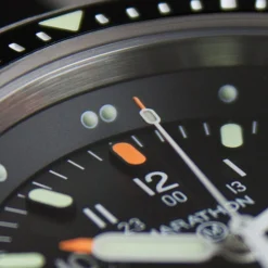The Marathon JSAR is water resistant down to 30 ATM – 300 meters (1000 feet) underwater. Made from 316L surgical grade stainless steel, the JSAR is a hefty, purpose built watch that will not let you down. The glass of the JSAR is in fact not glass, but a synthetic sapphire which will resist scratches, and is coated in an anti reflective coating to ensure maximum dial legibility.