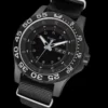 Case construction allows for 300M/1000ft water resistance by using a Screw-Down Crown and Screw-Down Side pushers. The revolving external bezel is calibrated from 0 to 60 in white on black background. This is a solid. big watch – case diameter is 44.5mm and high turning bezel is 46.6mm and is made of 316L Stainless Steel with a sapphire crystal. Encapsulated tritium (Isotope H3) light sources are used for dial at each hour position as well as the minute and hour hands, activity between 28-30 millicuries (under 30 millicuries).