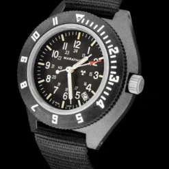 First developed by Marathon Watch Company in 1986, the Military Navigator Pilot’s Quartz was made as a request by the Kelly Air Force Base. They wanted a watch which could be used at high altitude, withstand extreme changes in pressure and altitude, as well as be an easy to read timepiece for a pilot. Marathon fulfilled this with the Military Navigator Pilot’s Quartz. The Military Navigator Pilot’s Quartz is made from a specialized fibershell case that is sweat and shock resistant, as well as lightweight. Included with the Military Navigator Pilots Quartz is a 20 millimetre nylon strap made under MIL-S-46383B, Type III.