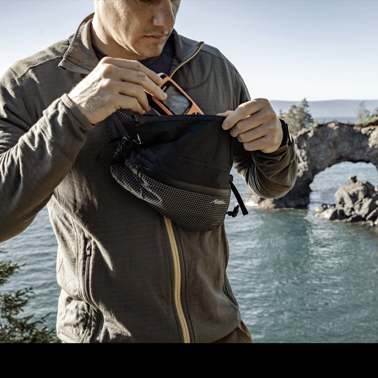 The adjustable belt can be worn at the waist or crossbody as a sling. An innovative integrated zipper on the rolltop main compartment can be used alone for fast access or rolled for full waterproofing. To stow, invert into the front pocket or compress further using the included mesh compression sack.
