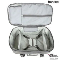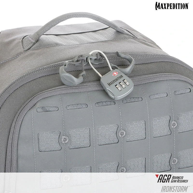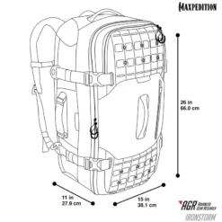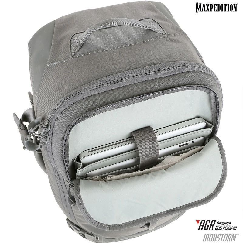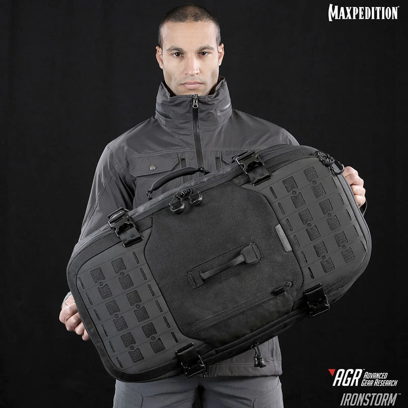 The Maxpedition AGR IRONSTORM is a comfortable pack designed for adventure travel. It can be carried in three different orientations depending on the user’s preference: by the side handle, by the shoulder strap or by the backpack straps. The main compartment is lockable and has an internal compression bib inside for securing contents during travel. Dividers are also located in the main compartment and can be zipped up or down for additional gear organization. The IRONSTORM has a padded compartment dedicated for a 15″ laptop or tablet on the exterior of the pack, making it easy for the user to access while on-the-go.