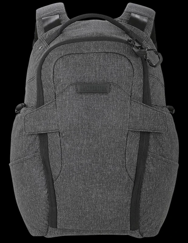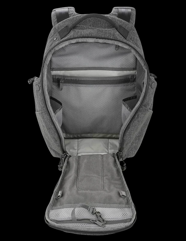 The Maxpedition Entity 21 is an ergonomic everyday carry pack with padded shoulder straps and quick release buckles. The main compartment has drawbridge straps for additional security, and there is a dedicated sleeve sized to fit most tablets. The front exterior has tuckable magnetic wings for quick temporary closing of the main compartment. The dual access rear compartment is fully loop-lined, and a double-sided hook Security Lockout Strip is included. Dual side ports are perfect for headphones, charger cables, etc.