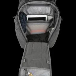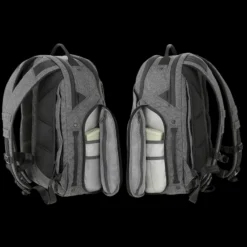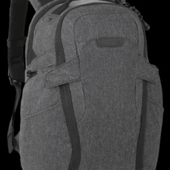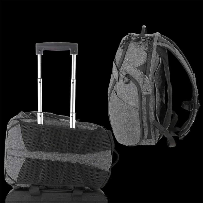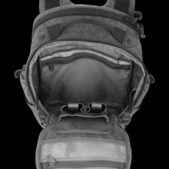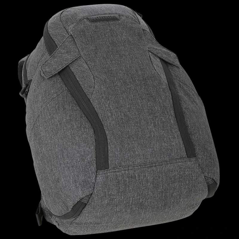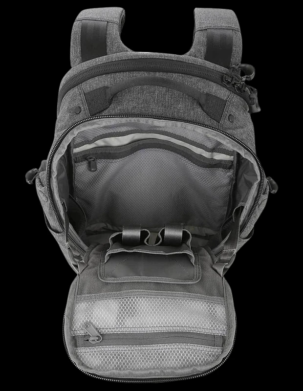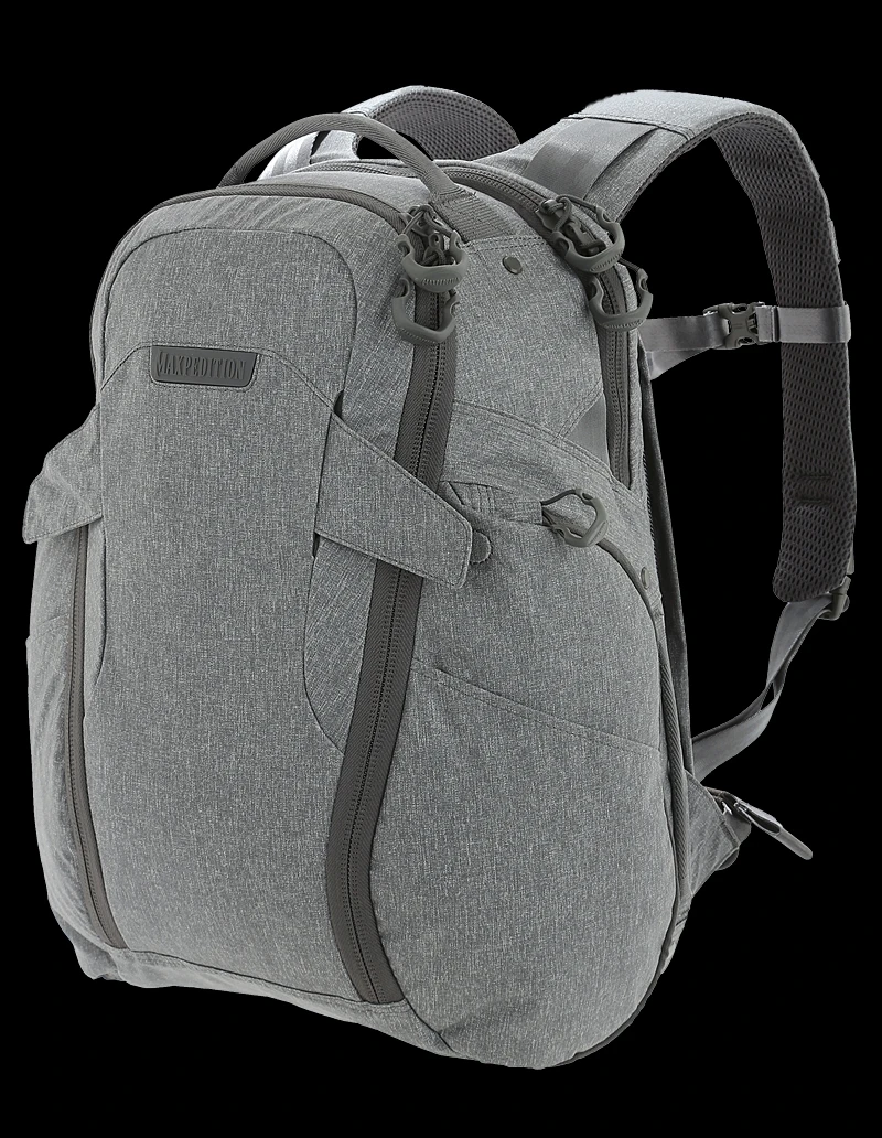 The Maxpedition Entity 23 is an ergonomic pack with padded shoulder straps and quick release buckles. There is a dedicated locking and padded compartment, which can hold a 15” laptop. The main compartment is also lockable, and has drawbridge straps for additional security. The front exterior has tuckable magnetic wings for quick temporary closing of the main compartment. The dual access rear compartment is fully loop-lined, and a double-sided hook Security Lockout Strip is included. Dual side ports are perfect for headphones, charger cables, etc. A rear trolley handle pass-through allows for off body carrying while travelling.