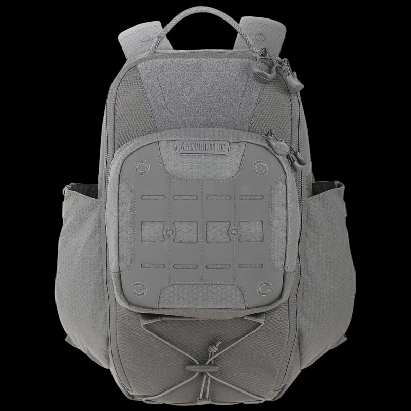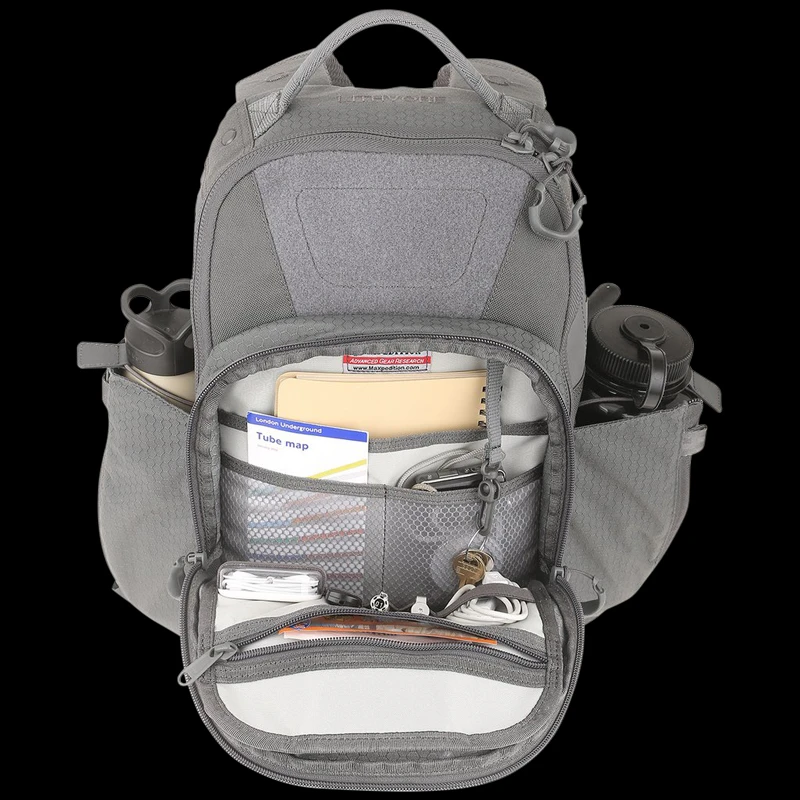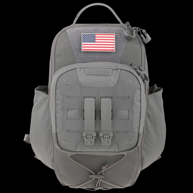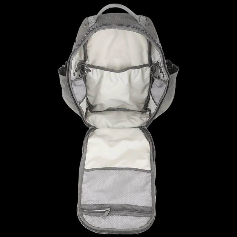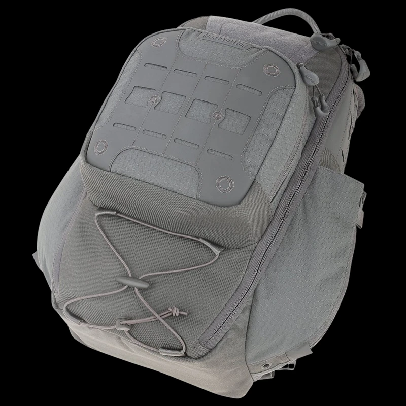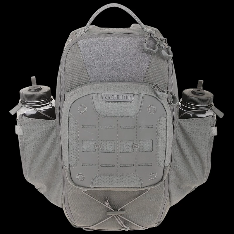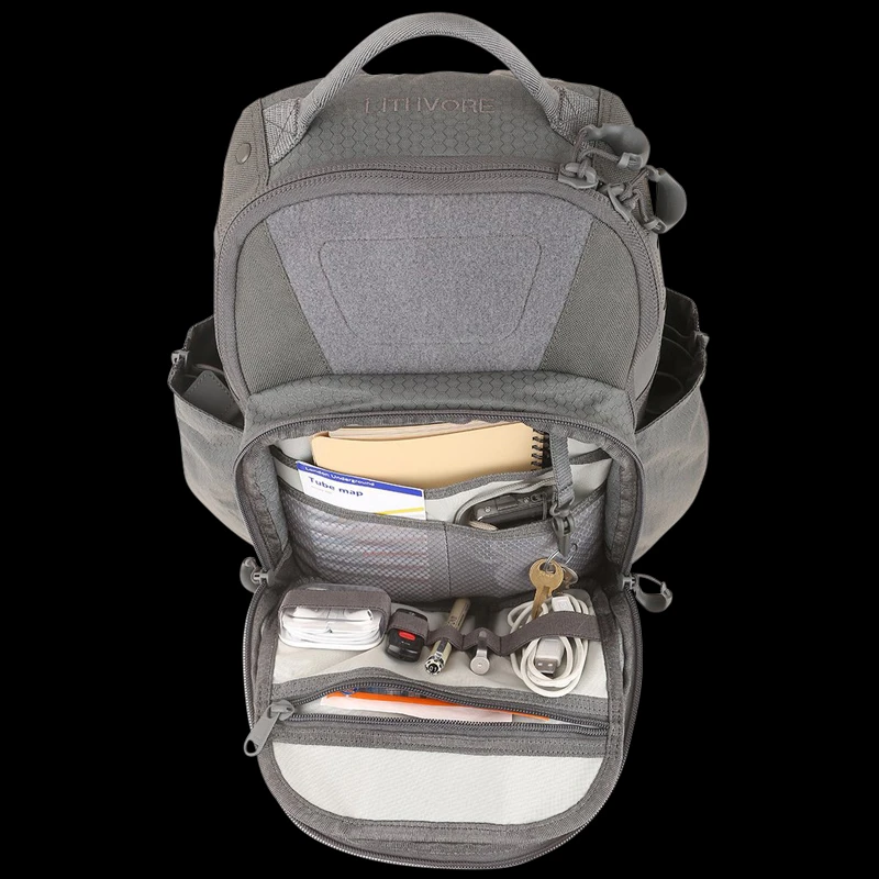 The Maxpedition Lithvore is an ergonomic backpack with padded shoulder straps. There is a top loop field for patch adhesion, a front admin pocket for added organization, a bottom shock cord retention array, two expandable bottle pockets with dual zipper garages, and a fully opening main compartment.
