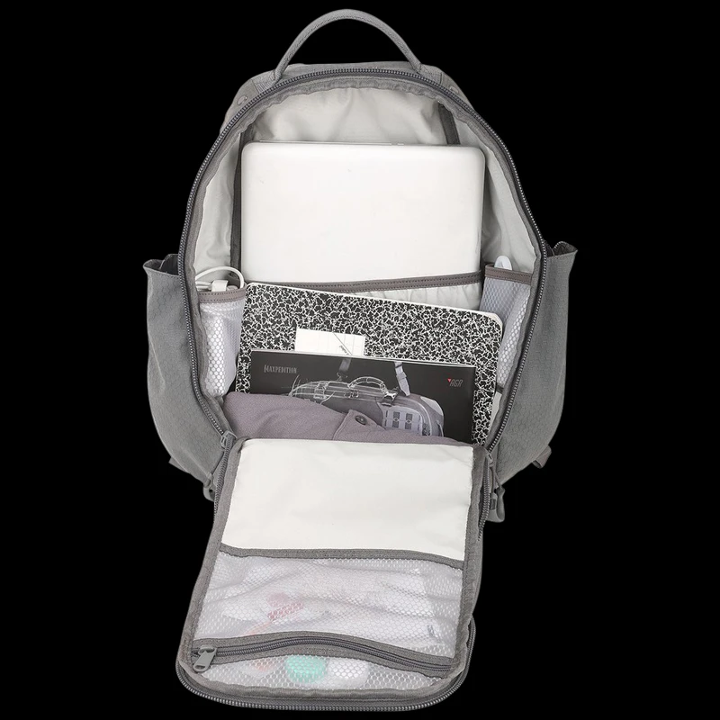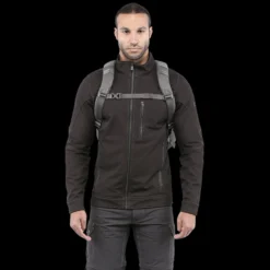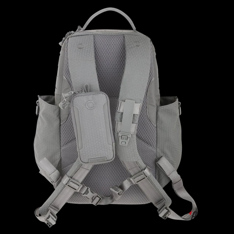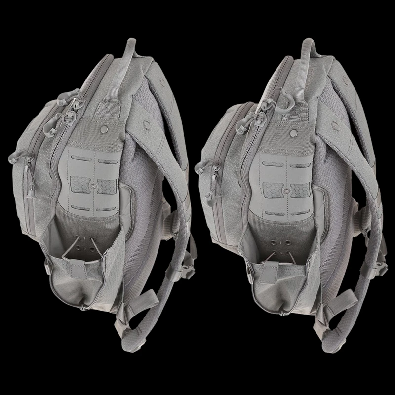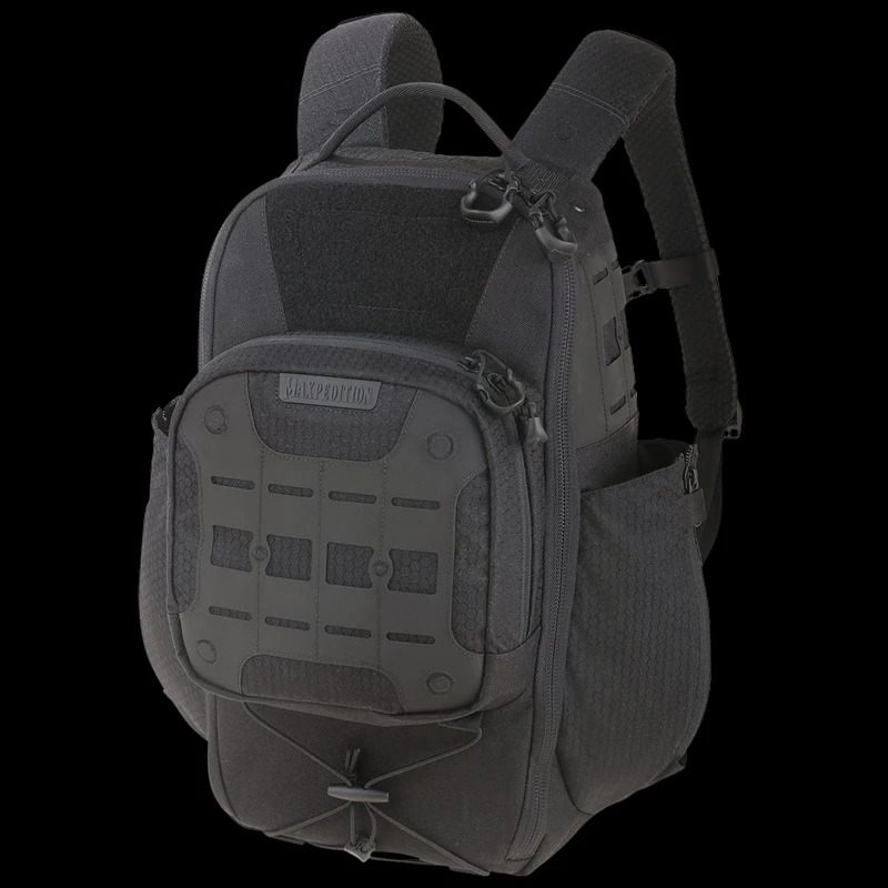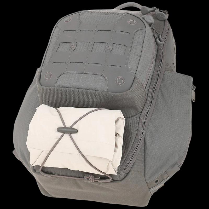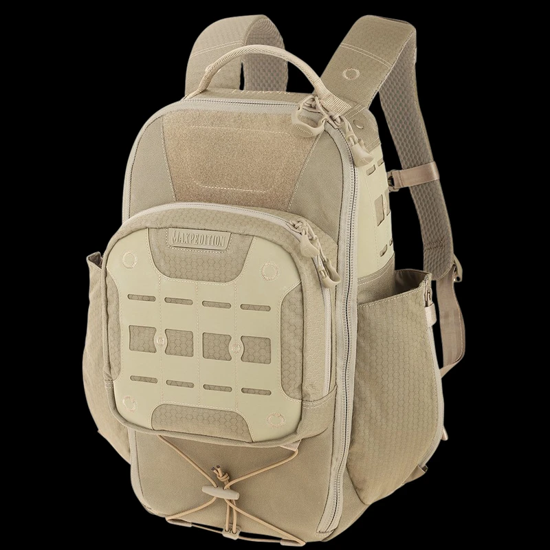The Maxpedition Lithvore is an ergonomic backpack with padded shoulder straps. There is a top loop field for patch adhesion, a front admin pocket for added organization, a bottom shock cord retention array, two expandable bottle pockets with dual zipper garages, and a fully opening main compartment.