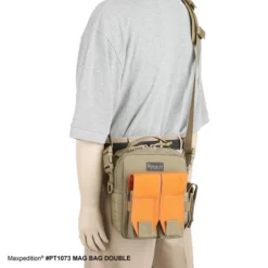 - Right: 2 (two) 1″ x 1.5″ x 5.5″ Pistol mag pouches, with elastic retention. Fits Glock, 1911, other pistol magazines