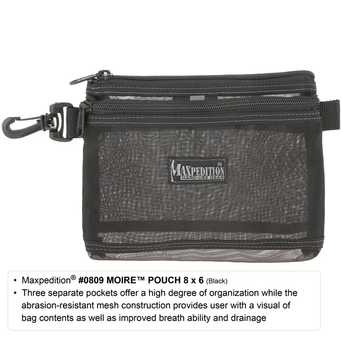 The MOIRE Pouch 8 x 6 (pronounced “maw-ray”) is named after the swirly wave patterns one sees when looking through this translucent pouch. Three separate pockets offer a high degree of organization while the abrasion-resistant mesh construction provides user with a visual of bag contents as well as improved breathability and drainage. This handy light-weight organizer can be dropped into pack pockets or simply hang on inside or outside of said packs with the swivel hook. 1″ webbing loops on either side allows use with SlikClips (sold separately).