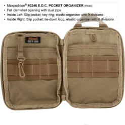 - Inside right: Slip pocket; tie down loop; elastic organizer with 6 divisions