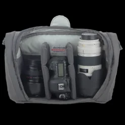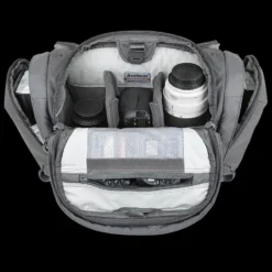 The Maxpedition Solstice Camera Bag is designed to fit one standard DSLR body plus two lenses (including 70-200mm F/2.8) or one Camcorder up to 23cm in length plus two camera built-in flashes. The main compartment includes four padded, flexible, and removable dividers for added organization. The lockable rear compartment also doubles as a device sleeve and can fit most standard sized tablets.