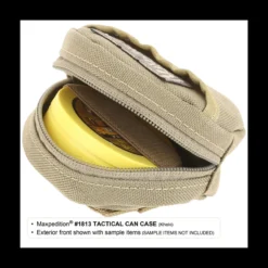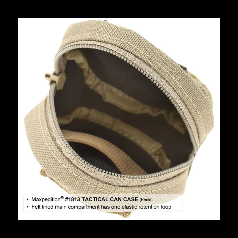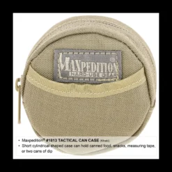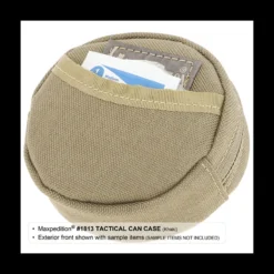 Tactical Can Case can hold canned foods / bubble tape / mint tins / measuring tape / bandages, etc. Main: 3.5 diameter x 1.5 thick, padded, with internal elastic retention Front slip: 2.5 wide x 2 deep