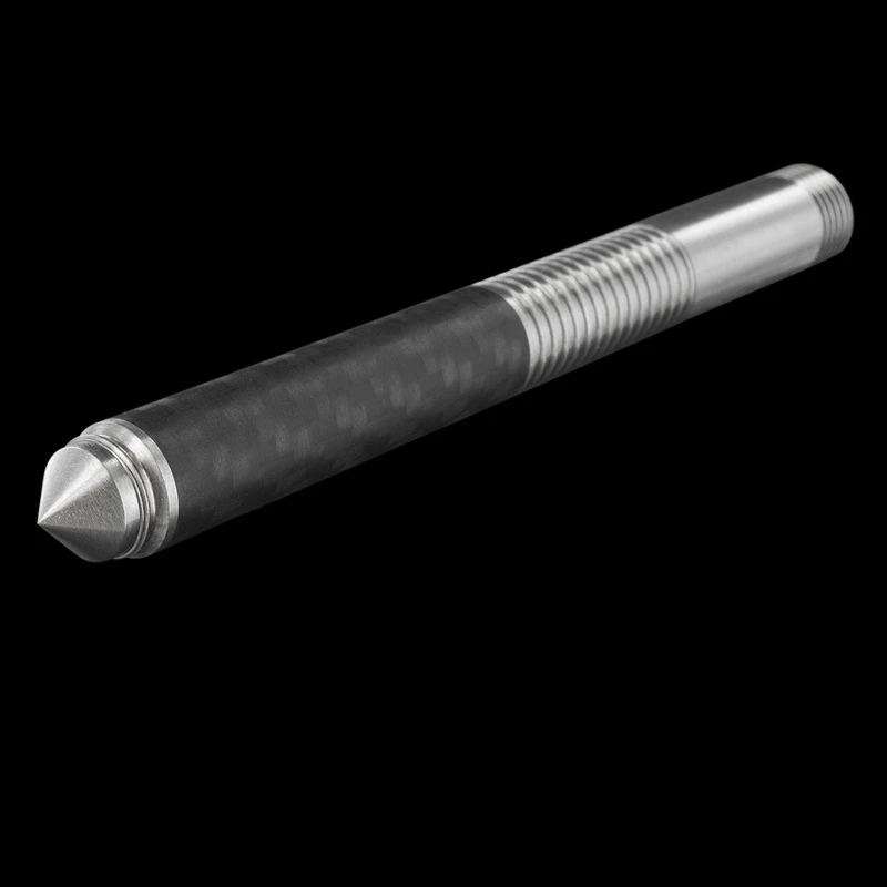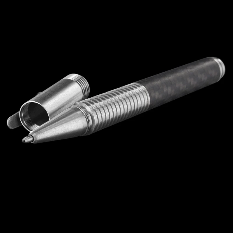 Everything except the body is made out of 6A14V Titanium. The body is Quadruple Woven Carbon Fibre. The pen comes equipped with a medium tip black Fisher Space Pen pressurised ink cartridge although it will also accept Parker ink carttridges. Included are seven ‘O’ rings which can be added to grip if desired.