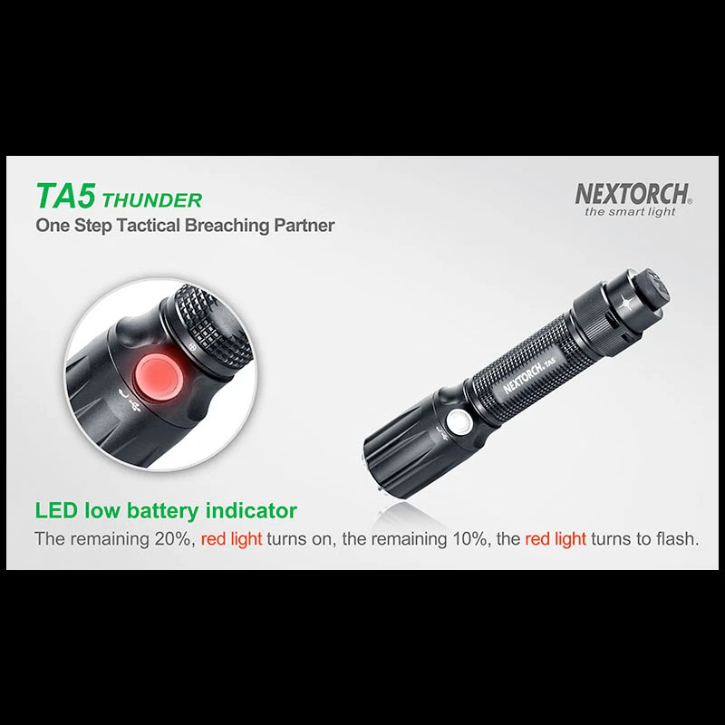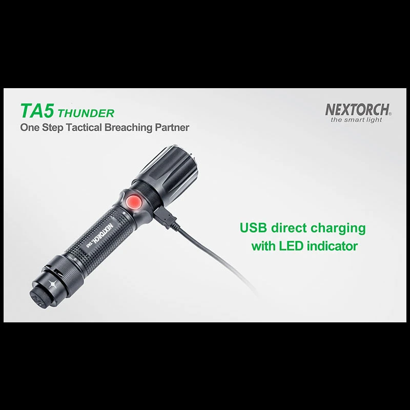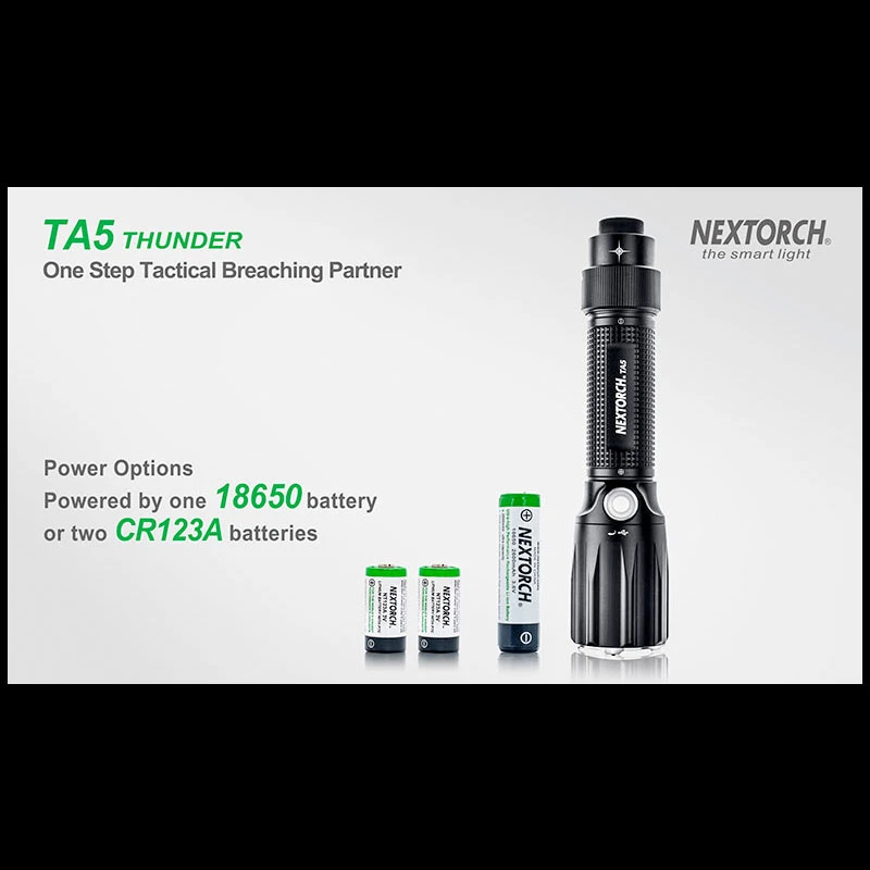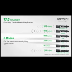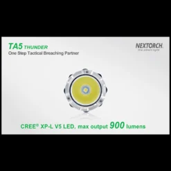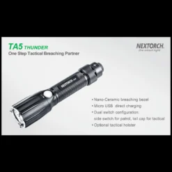 TA5 is a tactical flashlight designed for law enforcement personnel. It got several features that helps gain tactical advantage in operation. The TA5 got an especially hardened Nano-Ceramic embedded bezel, which is hard enough to smash the windows. Utilizes the CREE® XP-L V5 LED to deliver up to 900 lumens, which emits overwhelming wall of light to control with light. It got a Patrol side switch which circles through mode as well as a built-in low battery indicator. Runs with one 18650 battery or 2*CR123A batteries, and comes with USB direct charging port and indicator.
