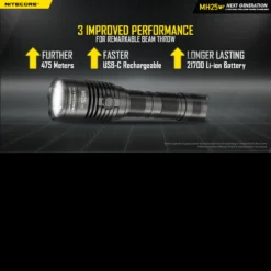 This is an upgraded version of the popular Nitecore MH25, this, the Nitecore MH25 V2 offers a further throw, faster recharging and longer runtimes with the 21700 battery. The improved 1,300 lumen maximum brightness means the torch is ideal for emergency use, search applications, outdoor activities and law enforcement.