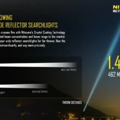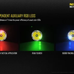 By utilising the Cree XP-L HI V3 LEDs domeless design, the MH27 produces a concentrated long range beam (up to 462 meters), normally only found in searchlights with much larger reflectors. Three independent auxiliary LEDs provide additional red, green and blue colour lighting.